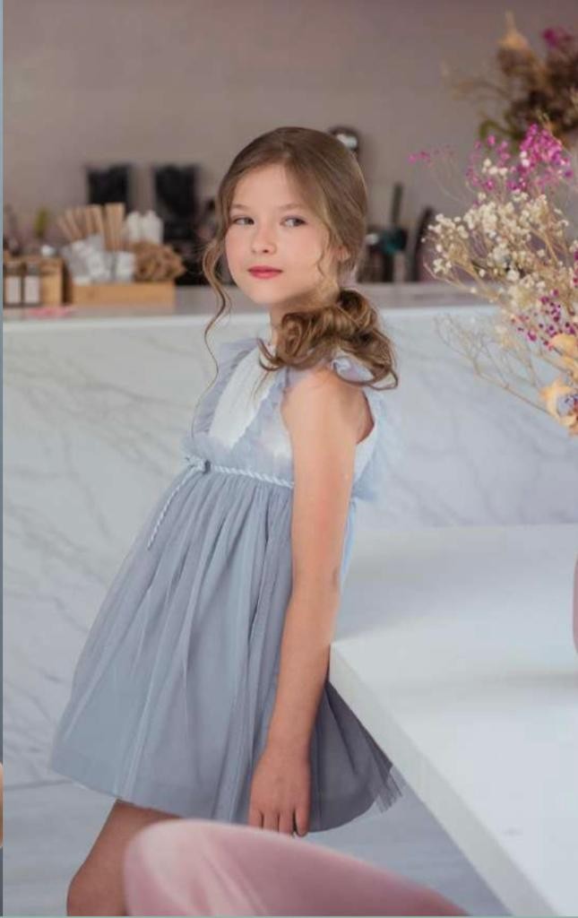 Precioso vestido de ceremonia. Mangas a la sisa, con rizo de tul en ella. Falda con rizo de tul, al igual que la sisa en celeste empolvado.