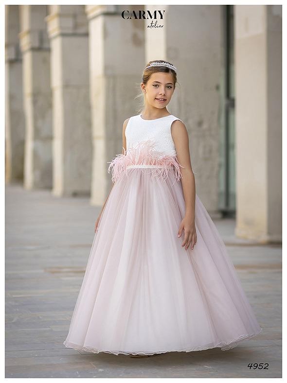 Vestido de ceremonia de la firma Carmy realizado en tul de color rosa. Para un look de princesa.