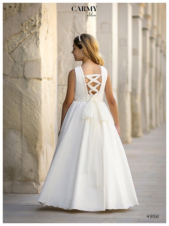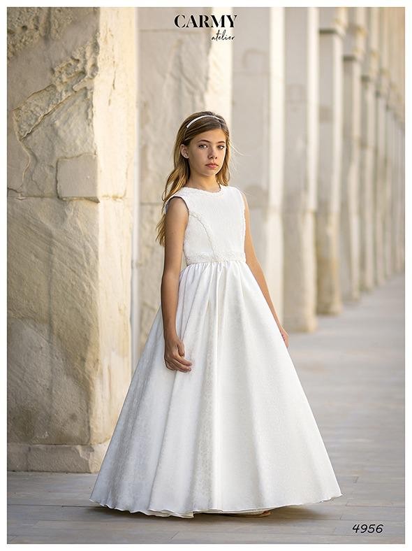 Vestido de ceremonia de la firma Carmy realizado en tul de purpurina color crudo. Para un look de princesa.
