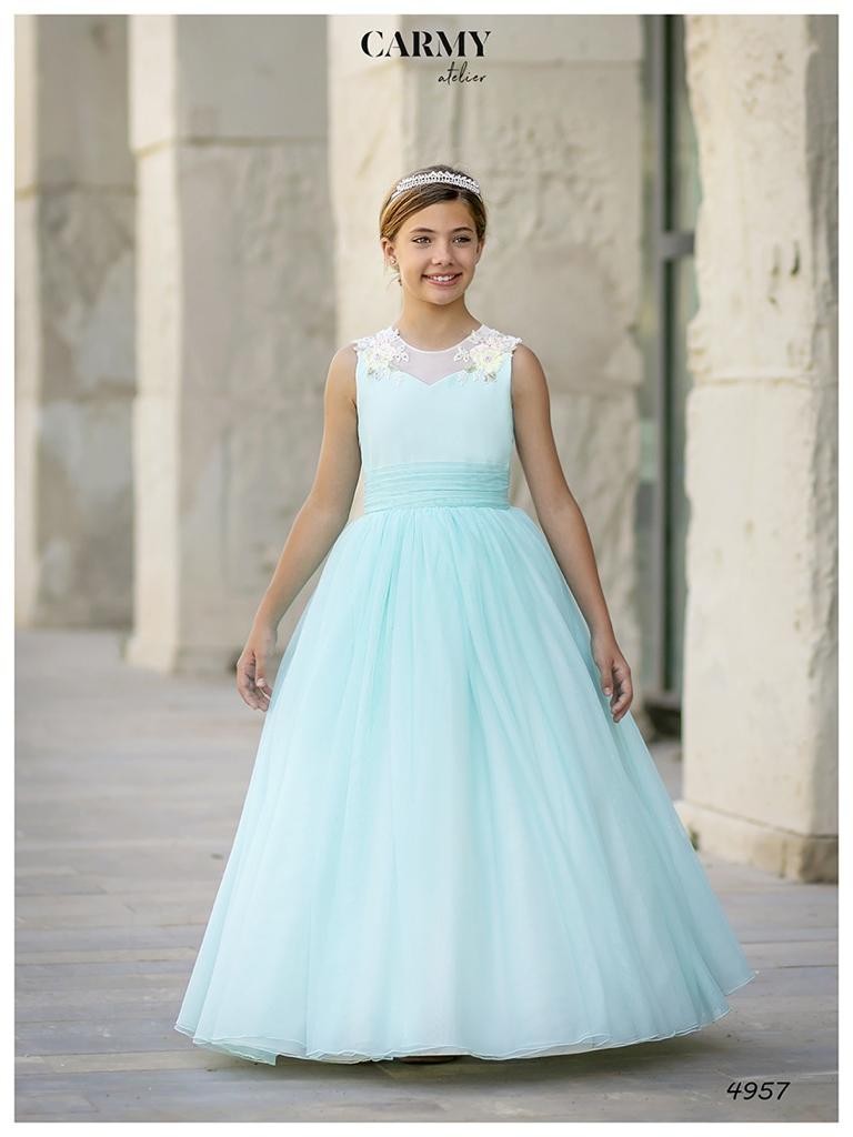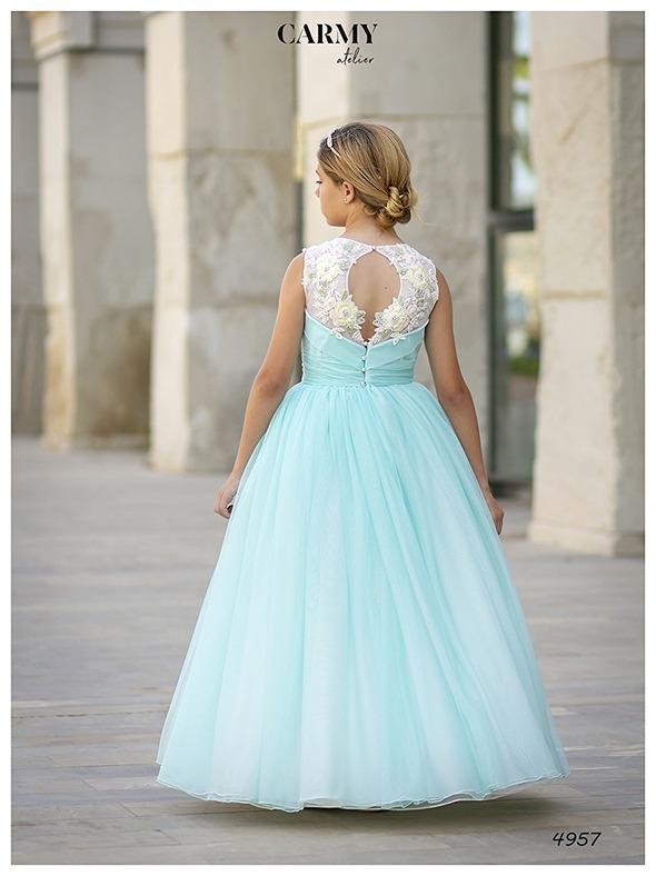 Vestido de dama de la firma Carmy realizado en tul con purpurina de color aguamarina.