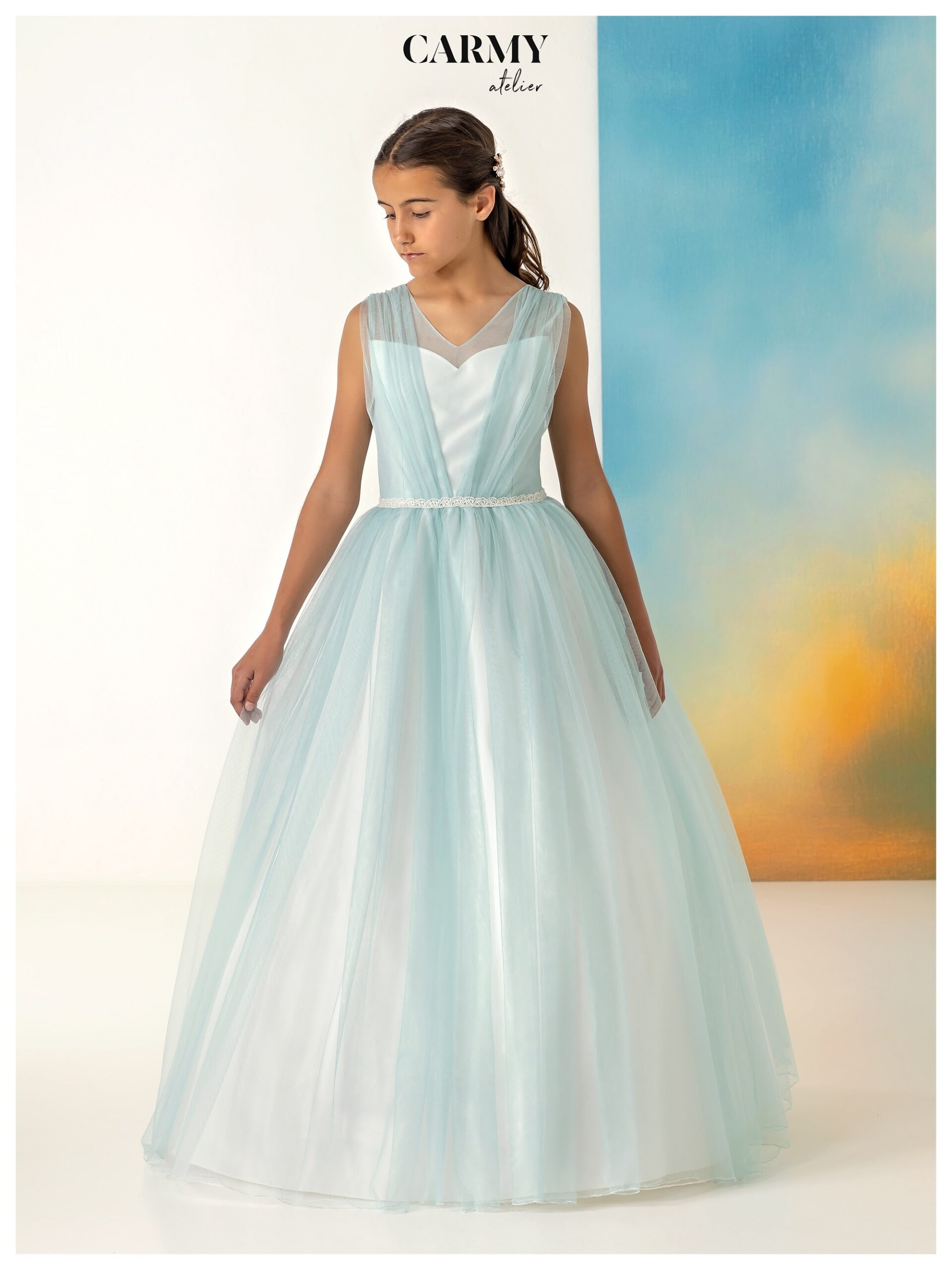 Vestido de dama de la firma Carmy realizado en tul con purpurina de color aguamarina.
