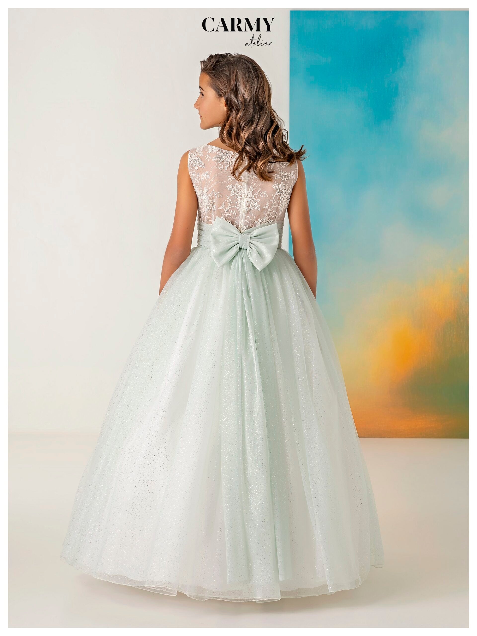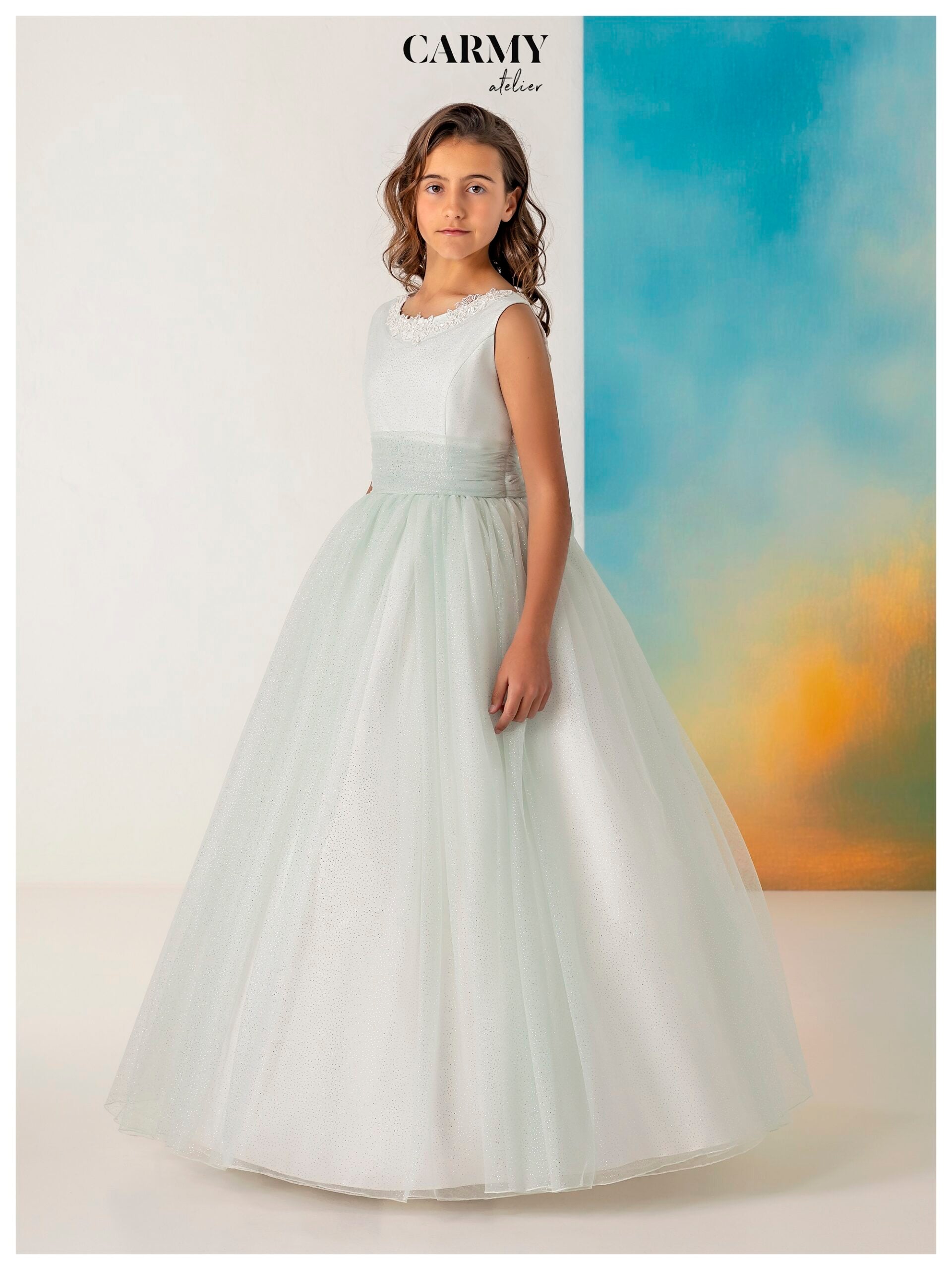 Vestido para reina y damas de fiesta de la firma Carmy confeccionado en tul verde brillante, que resalta con elegancia y sofisticación.