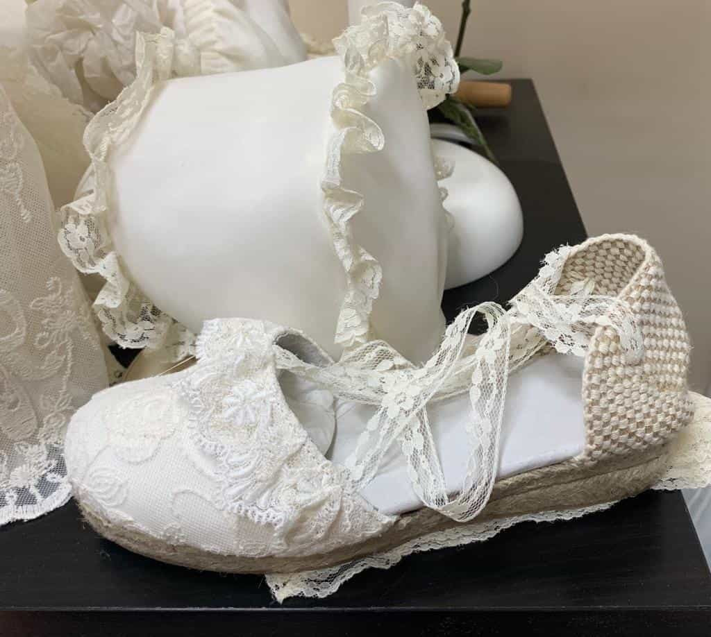 Estas esparteñas puede acompañar a cualquier vestido, están decoradas por un volante de tul y decoradas además con diversos apliques decorativos.