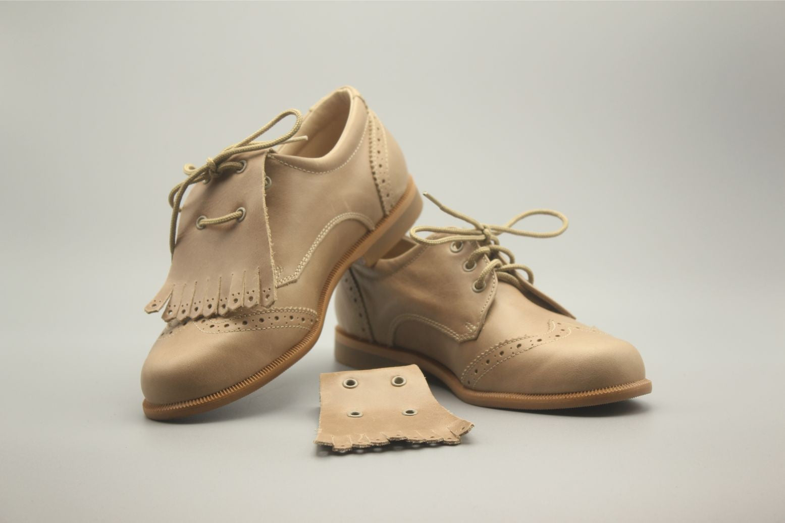 Zapatos con cordones y pieza de flecos que se puede poner y quitar a su gusto, 2 zapatos en uno perfectos para ceremonias y para combinar con las distintas tonalidades del traje.