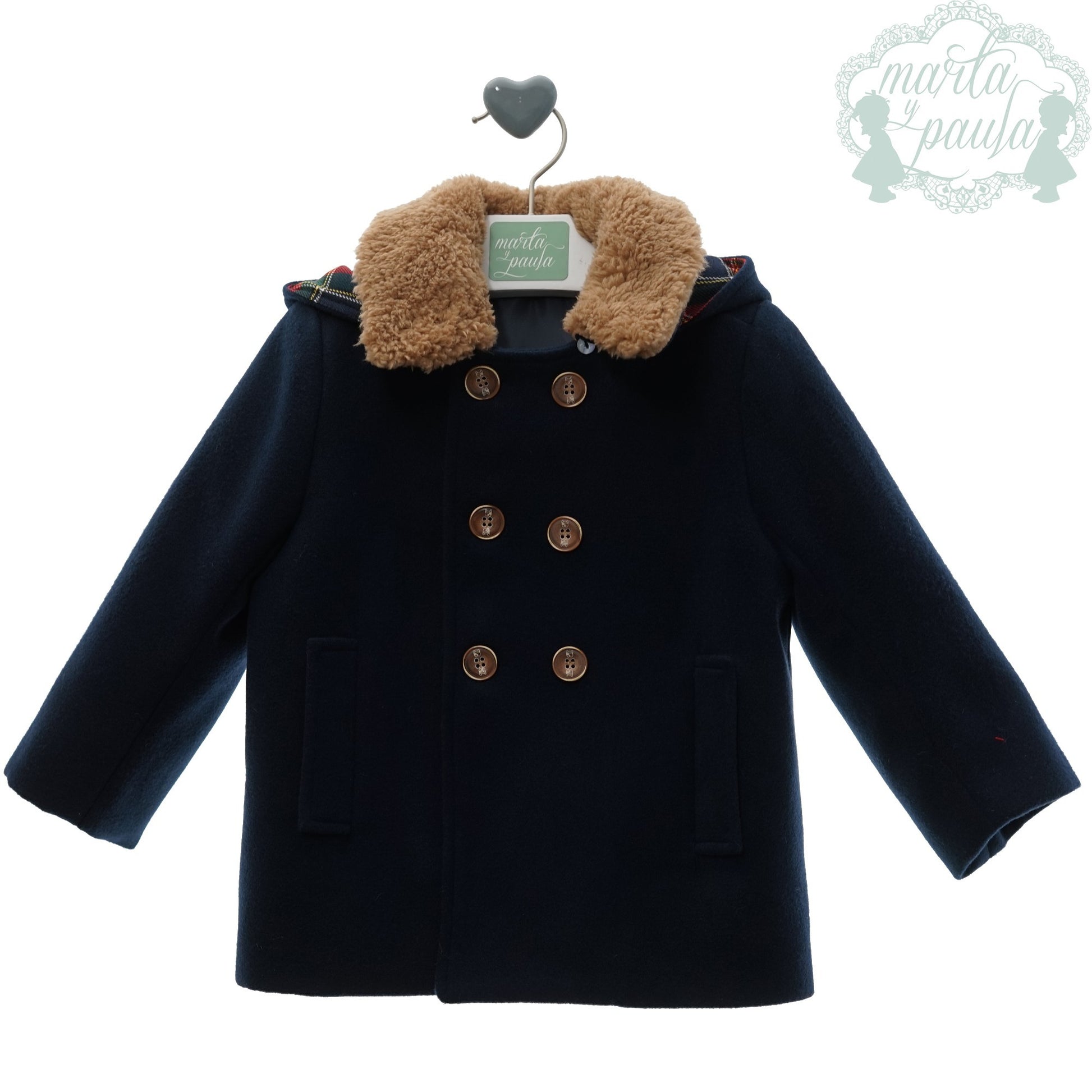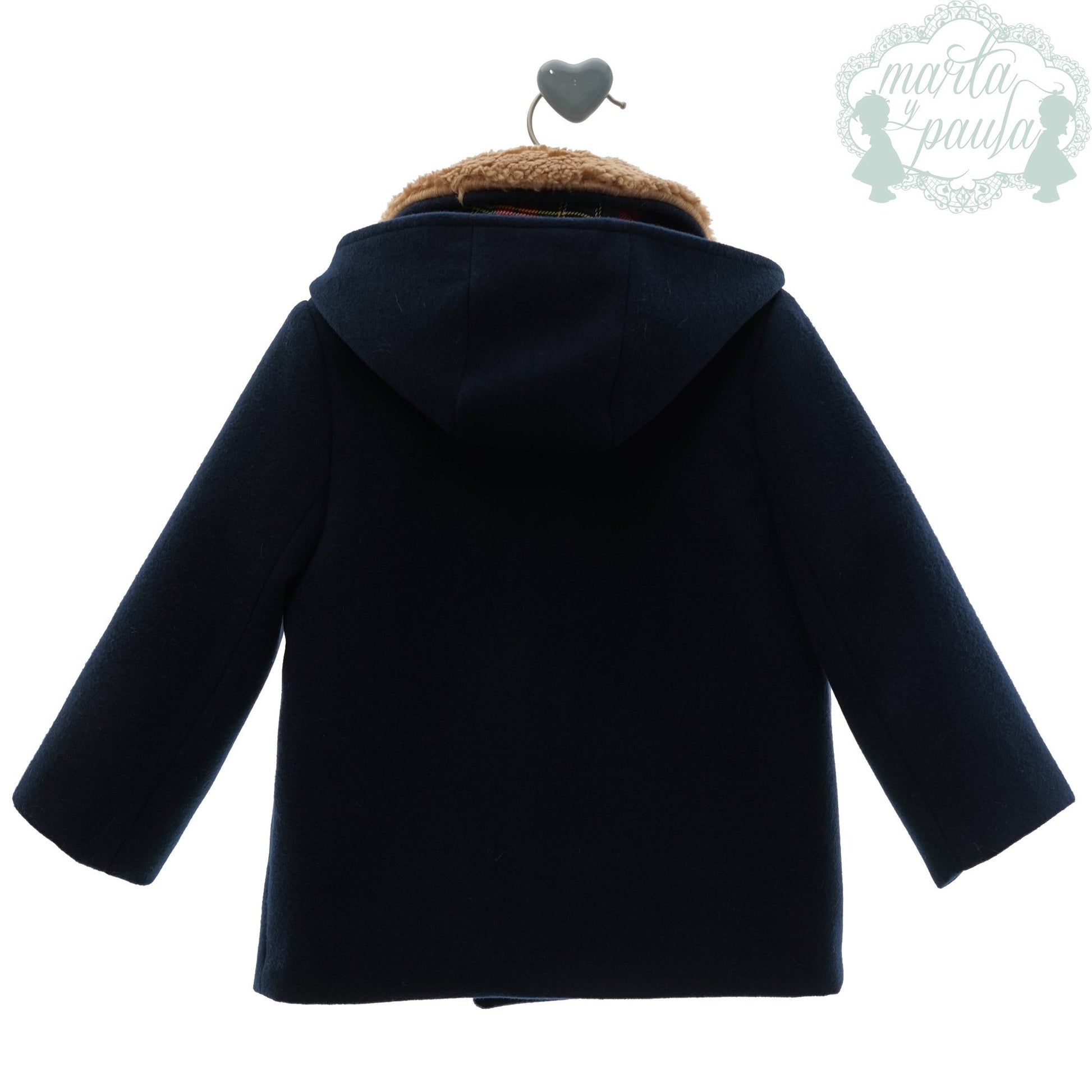 Este abrigo infantil para niño de Marta y Paula destaca por su diseño clásico en paño azul marino, perfecto para combinar con múltiples estilos. Cuenta con una capucha desmontable que ofrece versatilidad según las condiciones climáticas. Su cierre delantero de doble abotonadura asegura protección adicional contra el viento y el frío. Equipado con dos bolsillos frontales, proporciona funcionalidad para que los niños guarden pequeños objetos o mantengan las manos calientes.