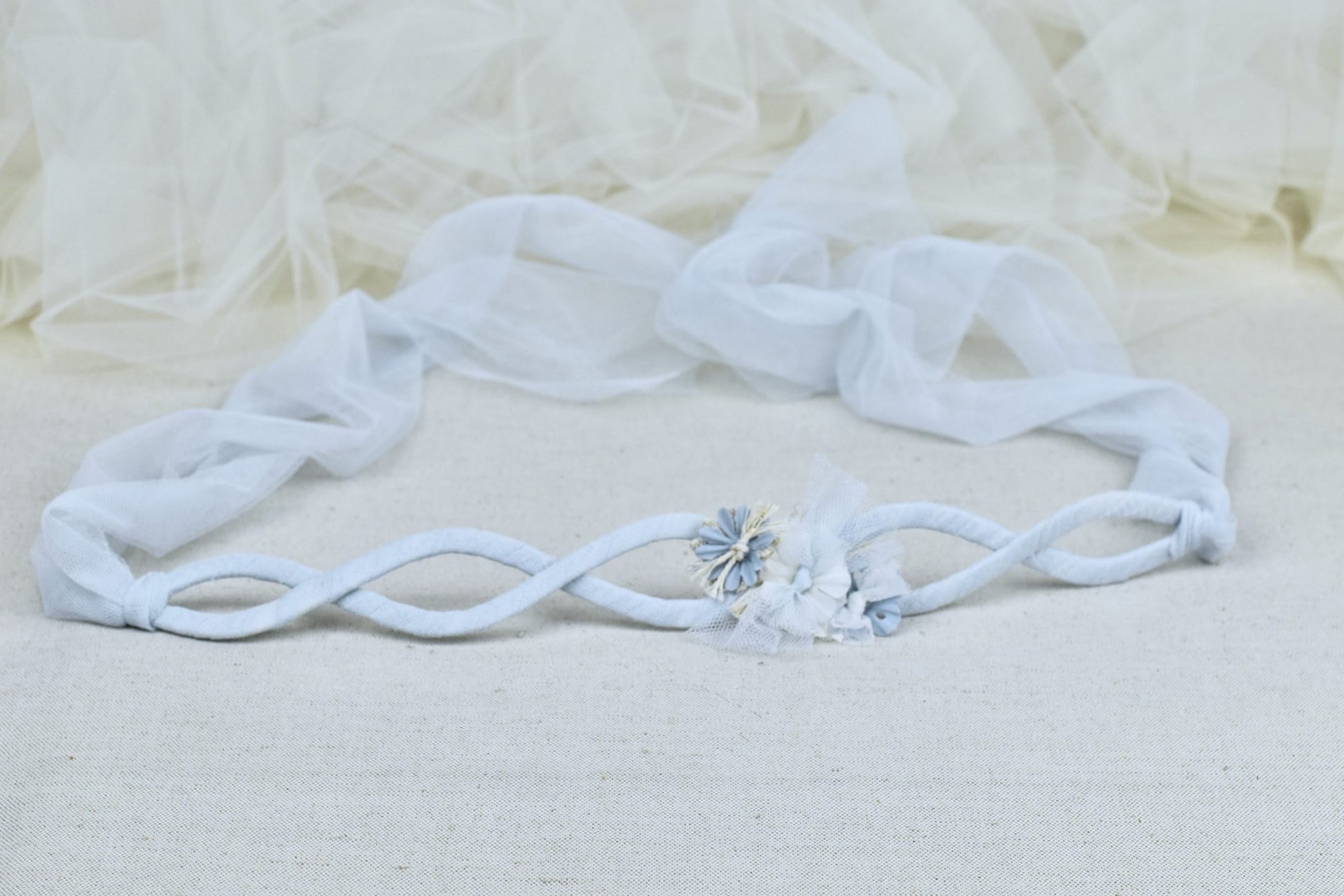 Tira de ochos forrada en tul azul y cintas para atar, adorno de pétalos al tono y tu plisado.