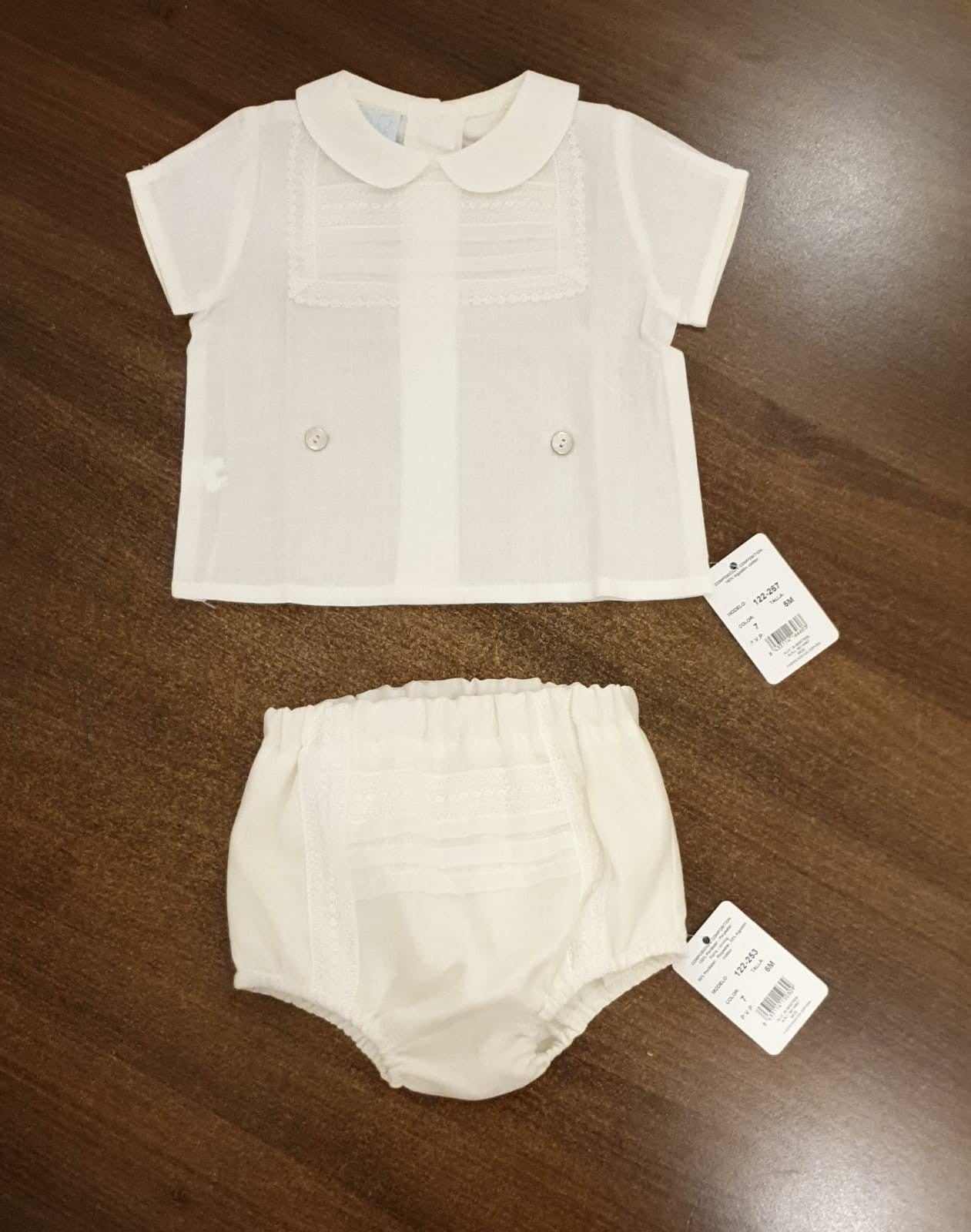 Esta confeccionado en algodón de alta calidad. Tiene cuello bebé y bonita pechera cuadrada con puntillas y entredoses.