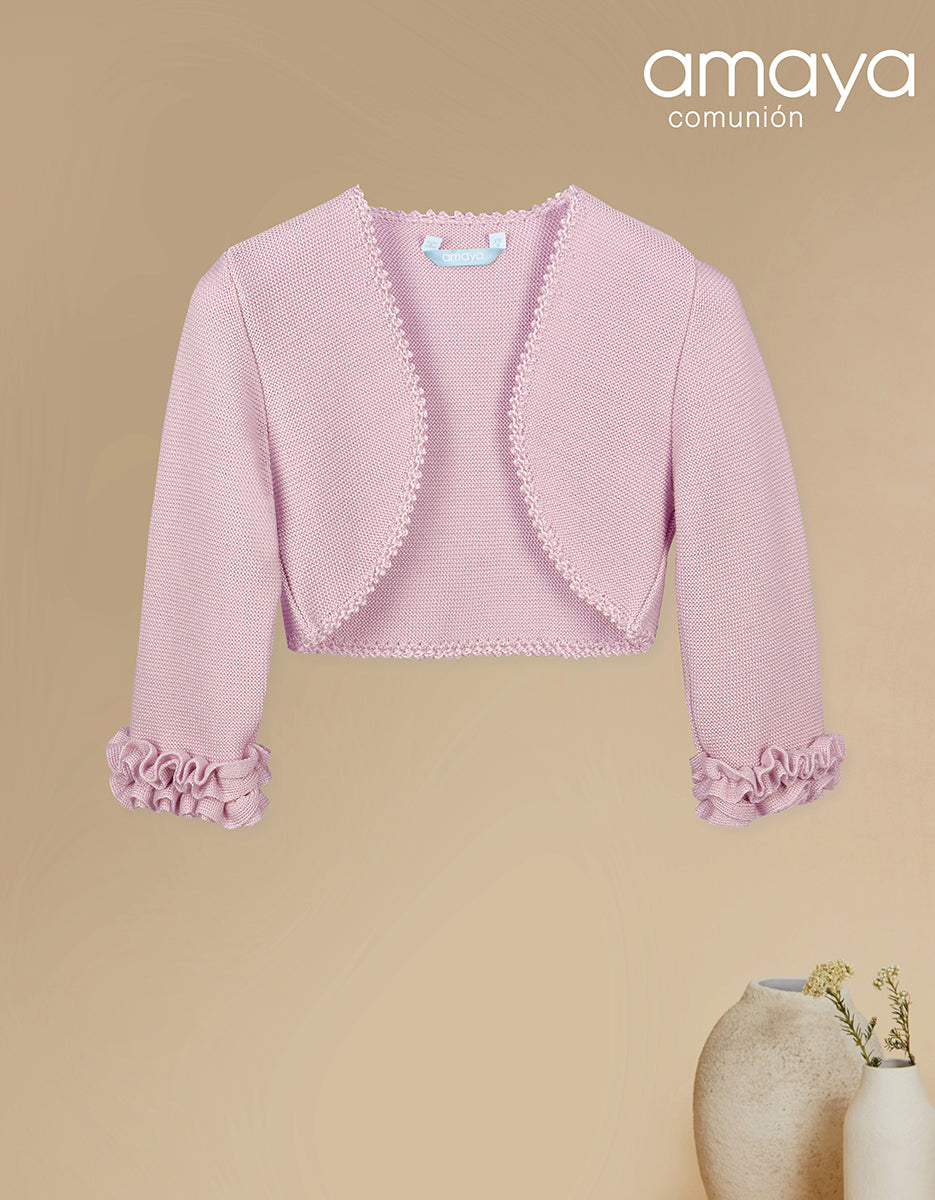 Chaqueta de punto para niña de la nueva colección de comunión de Amaya Fashion for Kids que es perfecta para acompañar a los vestidos de comunión y ceremonia.