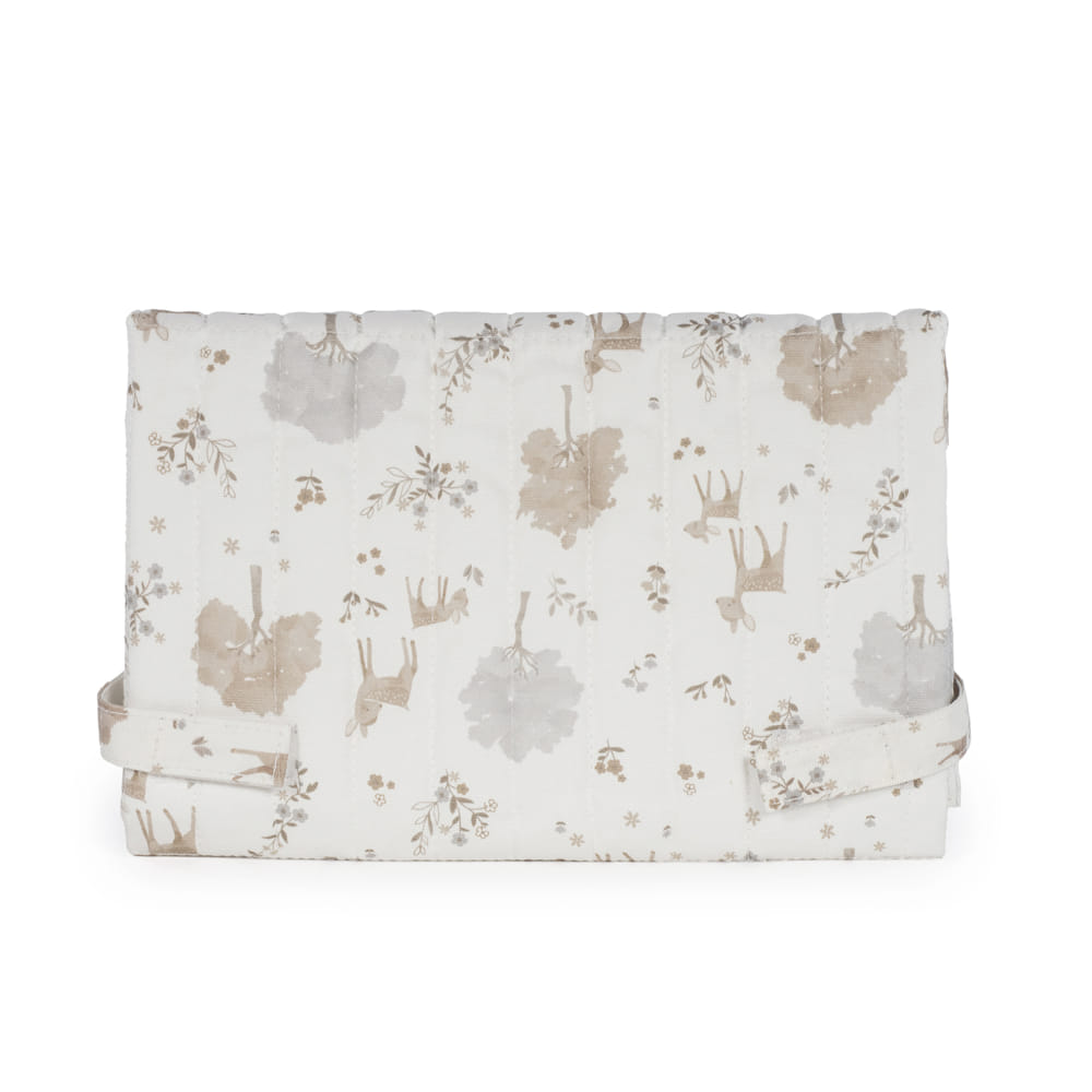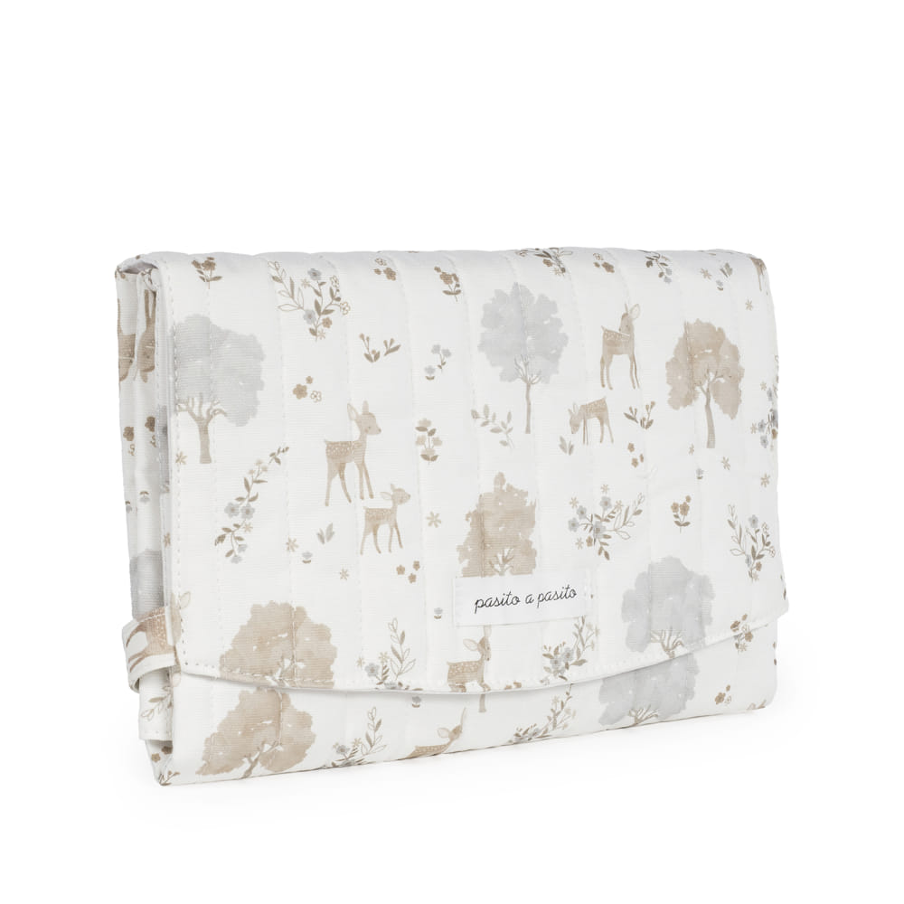 El cambiador para bebé Nara de Pasito a pasito elaborado elaborado en loneta de algodón 100% con un delicado estampado de ciervos y árboles en tonos neutros, es un modelo muy cómodo, práctico y fácil de transportar. Un patrón especialmente ideado para utilizarlo cuando necesites cambiar a tu bebé. Es plegable para facilitar su trasladarlo a todos lados. Es un diseño tan elegante como funcional, porque se presenta en formato plegado para hacerlo portátil. Cuenta con cintas de agarre de cierre para mantener el cambiador cerrado y así se reduce su espacio para llevarlo dentro de la bolsa de maternidad. Acabados de calidad. El cambiador de bebé cuenta con un forro interior acolchado e impermeable para hacerlo más fácil de limpiar una vez termines de usarlo y así evitar que se acumulen olores en el interior. Está fabricado con materiales de gran calidad, libres de colorantes azoicos, ftalatos y sustancias nocivas para la salud. Además se puede lavar a mano o a máquina a temperaturas de hasta 30º. Los productos para bebé de Pasito a Pasito cuentan con un diseño muy diferente a todos los demás; gracias a sus colecciones más trabajadas, caprichosas y a la vez prácticas, que utilizan materiales de primera calidad para remarcar la elegancia y la armonía en cada una de sus piezas. Nuestros modelos son exclusivos y de estilo inconfundible, pensados en madres actuales que gozan de buen gusto y que aprecian los detalles tanto como nosotros. Especificaciones: Materiales: 100% algodón. Medidas: 50×70 cm.