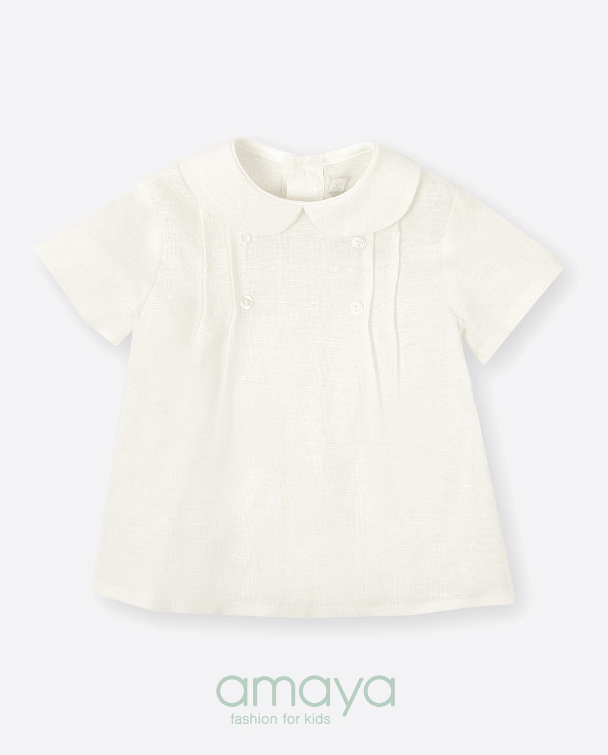 Manga corta y cuello bebé. Esta confeccionado en tejido de lino de alta calidad.