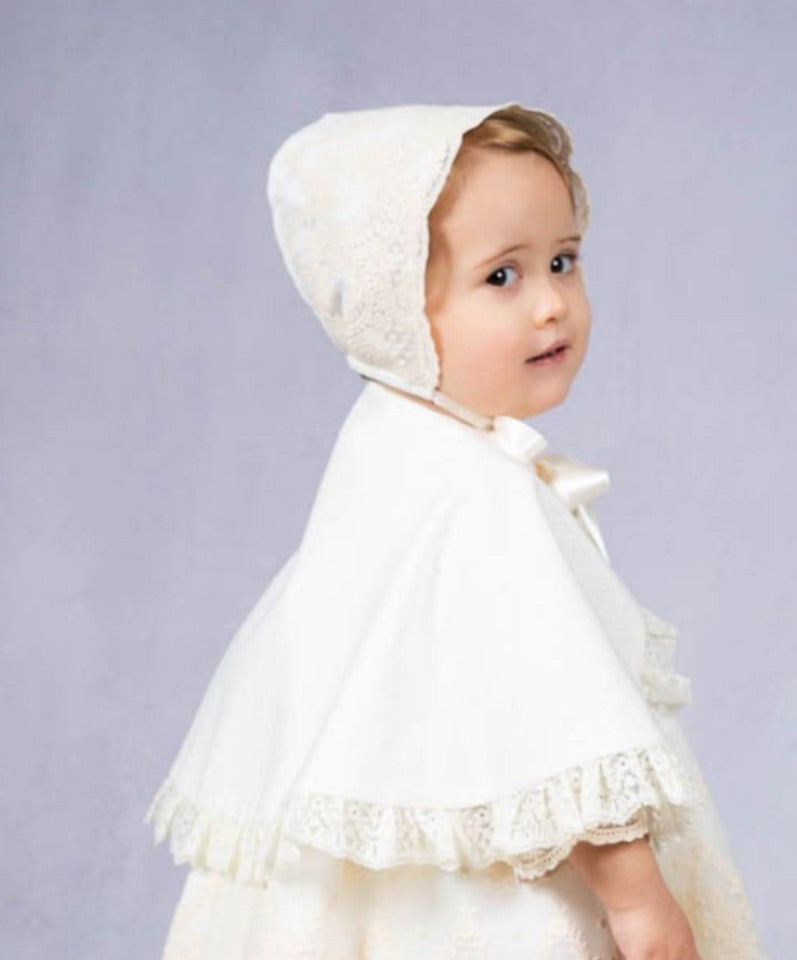 Capa para la ceremonia del bautismo en lino con bordados con puntillas. Tiene un lazo de raso para ajustar al cuello.
