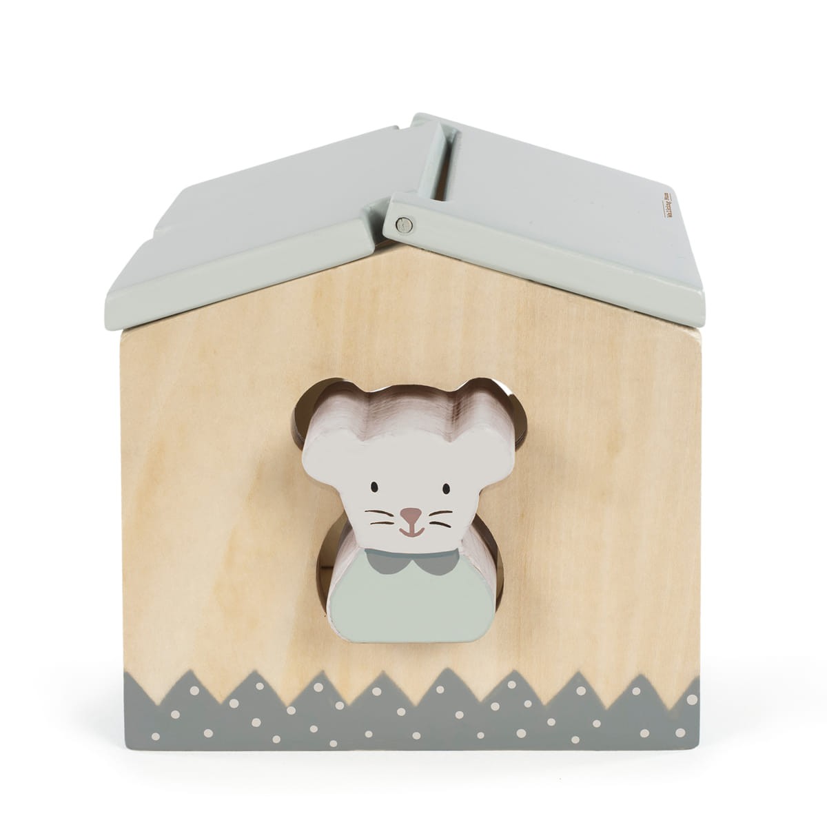 Casita de madera con un acabado natural y techo en color pastel. Incluye varias formas geométricas coloridas que se encajan en los espacios correspondientes. Incluye 1 casita y 6 piezas geométricas (ratoncito, queso, estrella, corazón, círculo y triángulo).