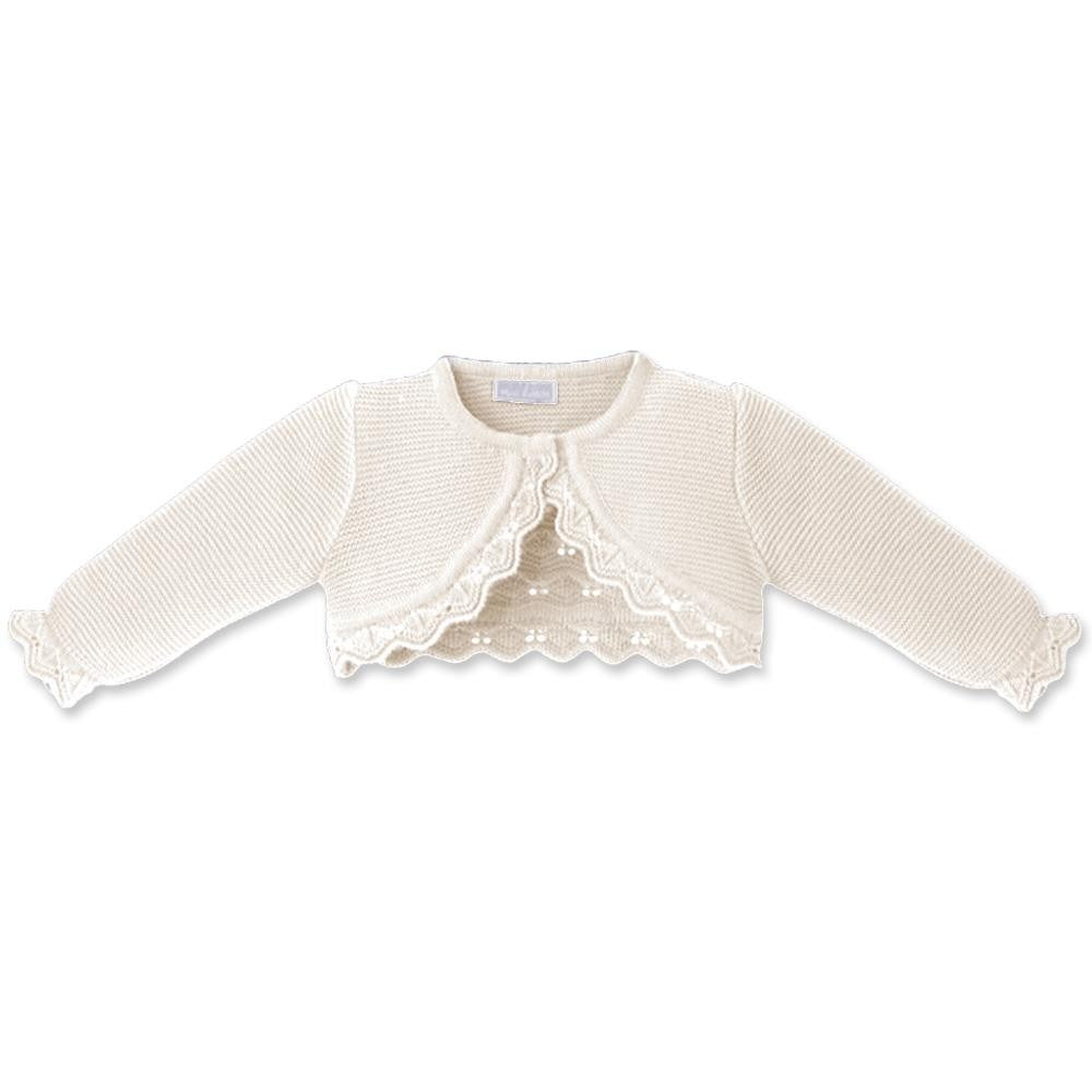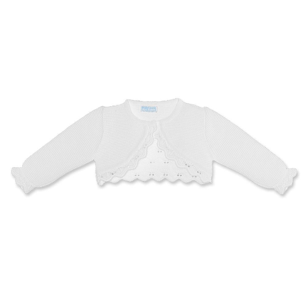 Detalles calados en la espalda y onditas en los acabados y en los puños de las mangas.
