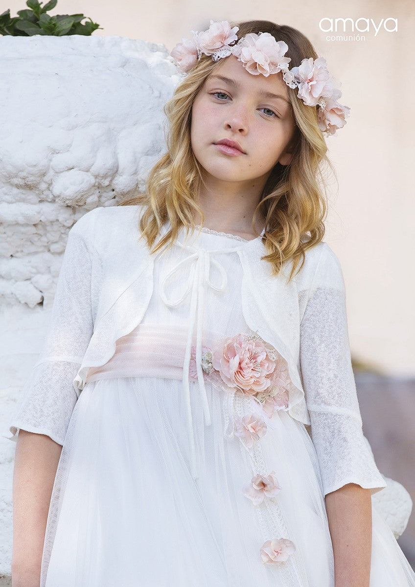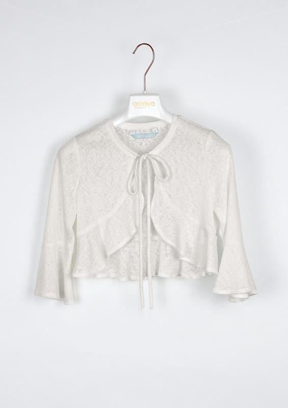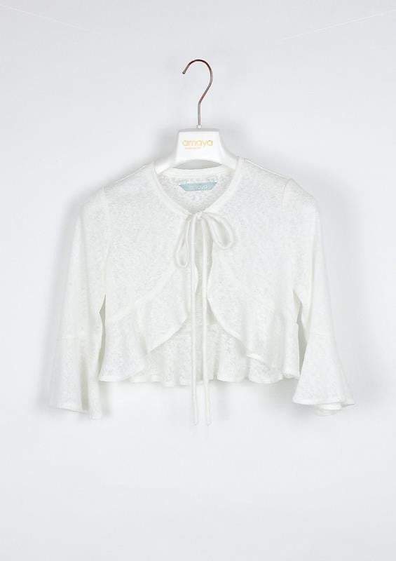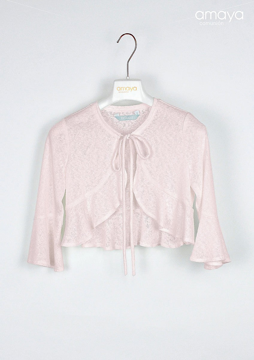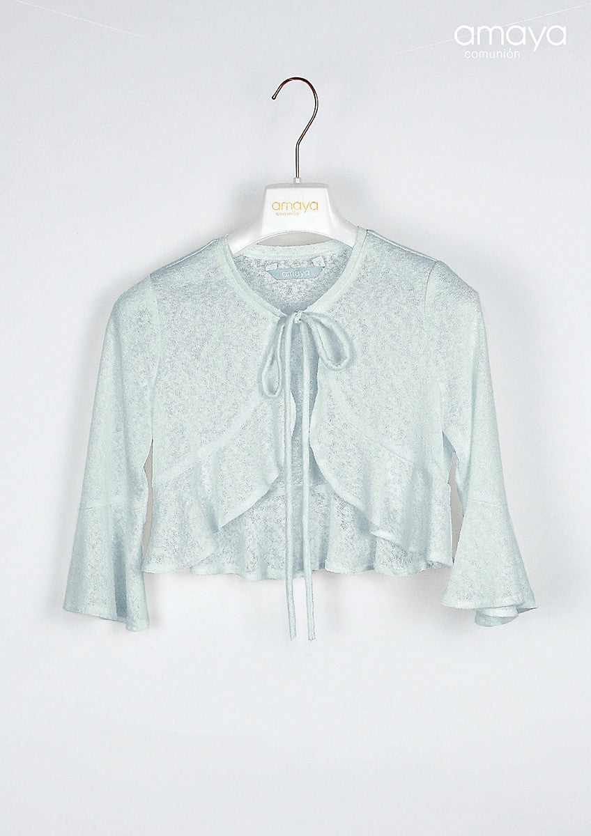 Bonita chaqueta de punto de manga francesa con volantes en la solapa y en las mangas.