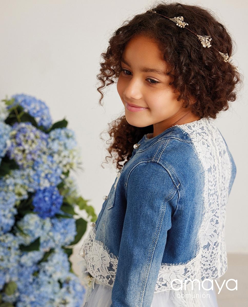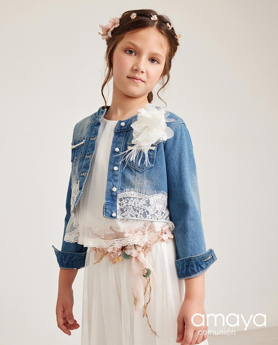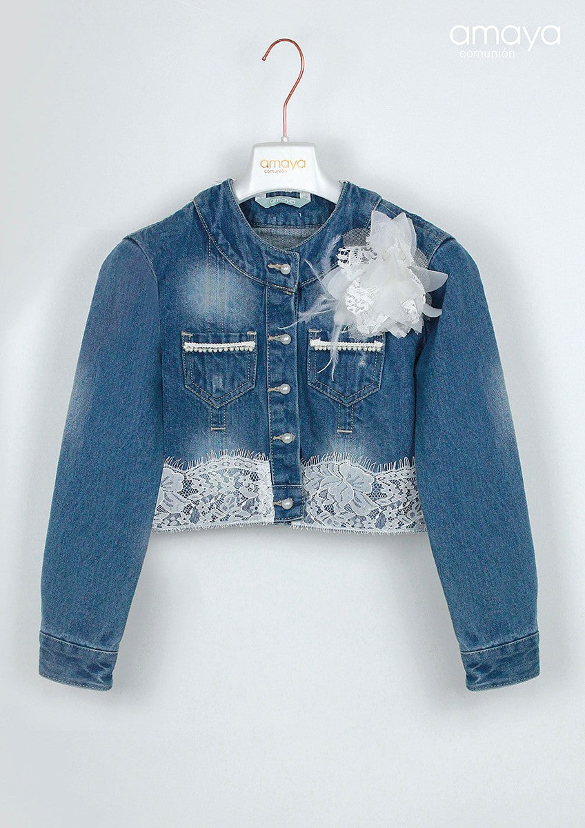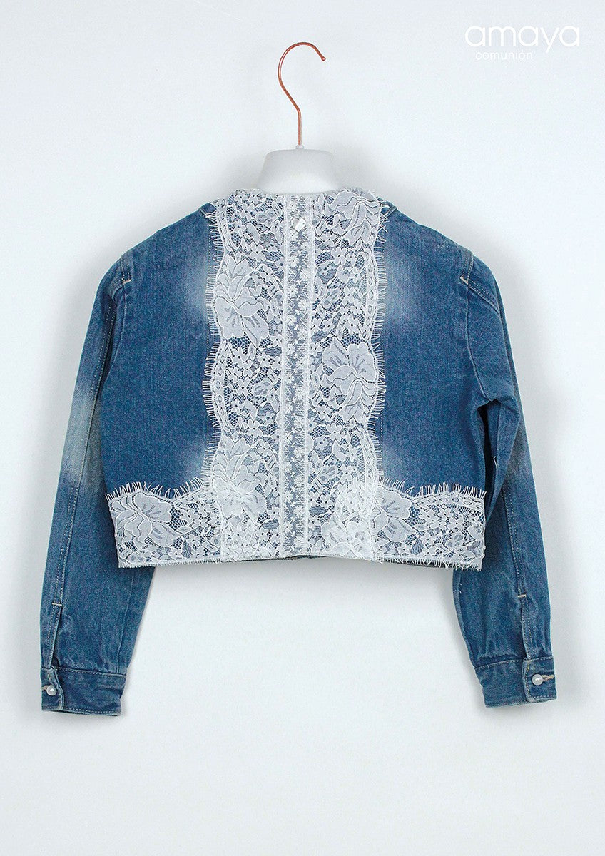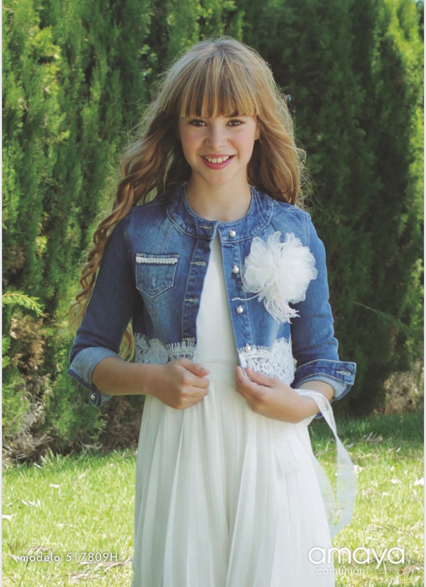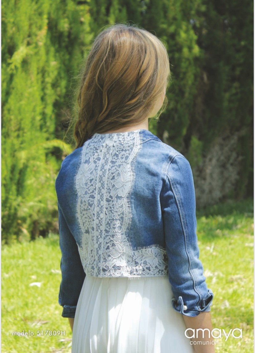 Especialmente diseñada tanto para comunión como para ceremonia, confeccionada en tejido vaquero de alta calidad, decorada con piedras en blancas con brillo que la hacen muy elegante. y tiene varias piezas de encaje blanco tanto por la parte delantera como trasera. Lleva licra que que se adapte mejor al cuerpo de la niña.