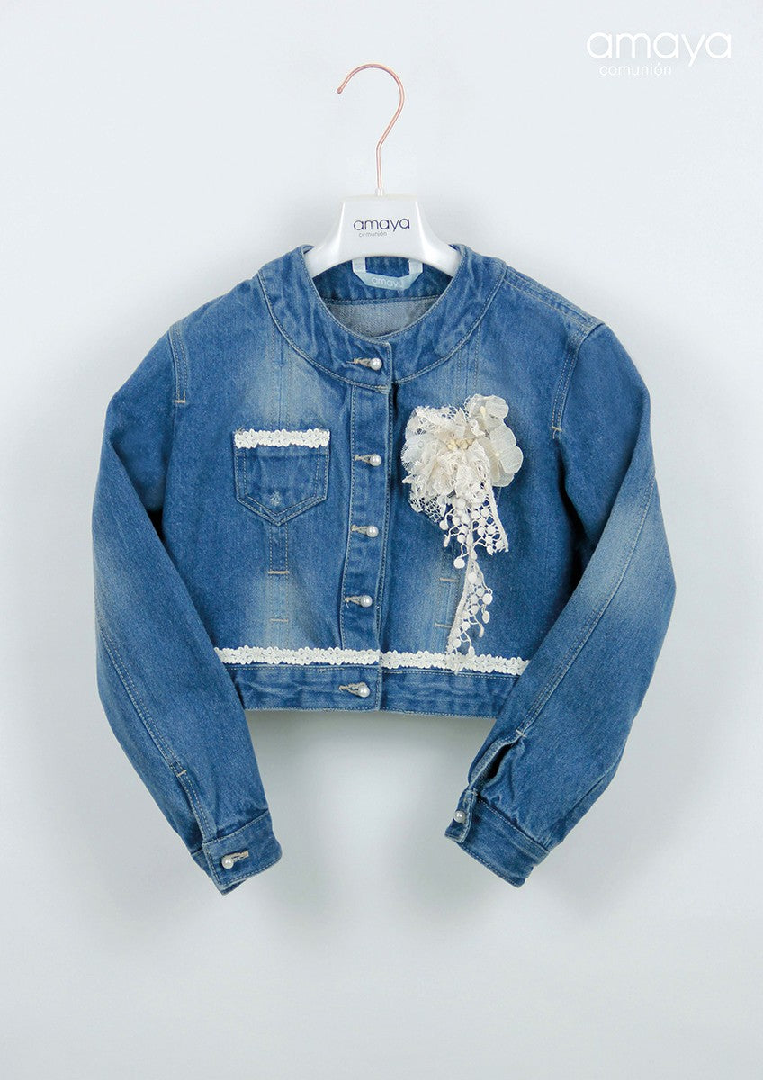 Especialmente diseñada tanto para comunión como para ceremonia, confeccionada en tejido vaquero de alta calidad, decorada conencajes que la hacen muy elegante.