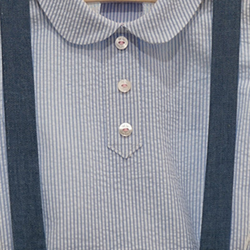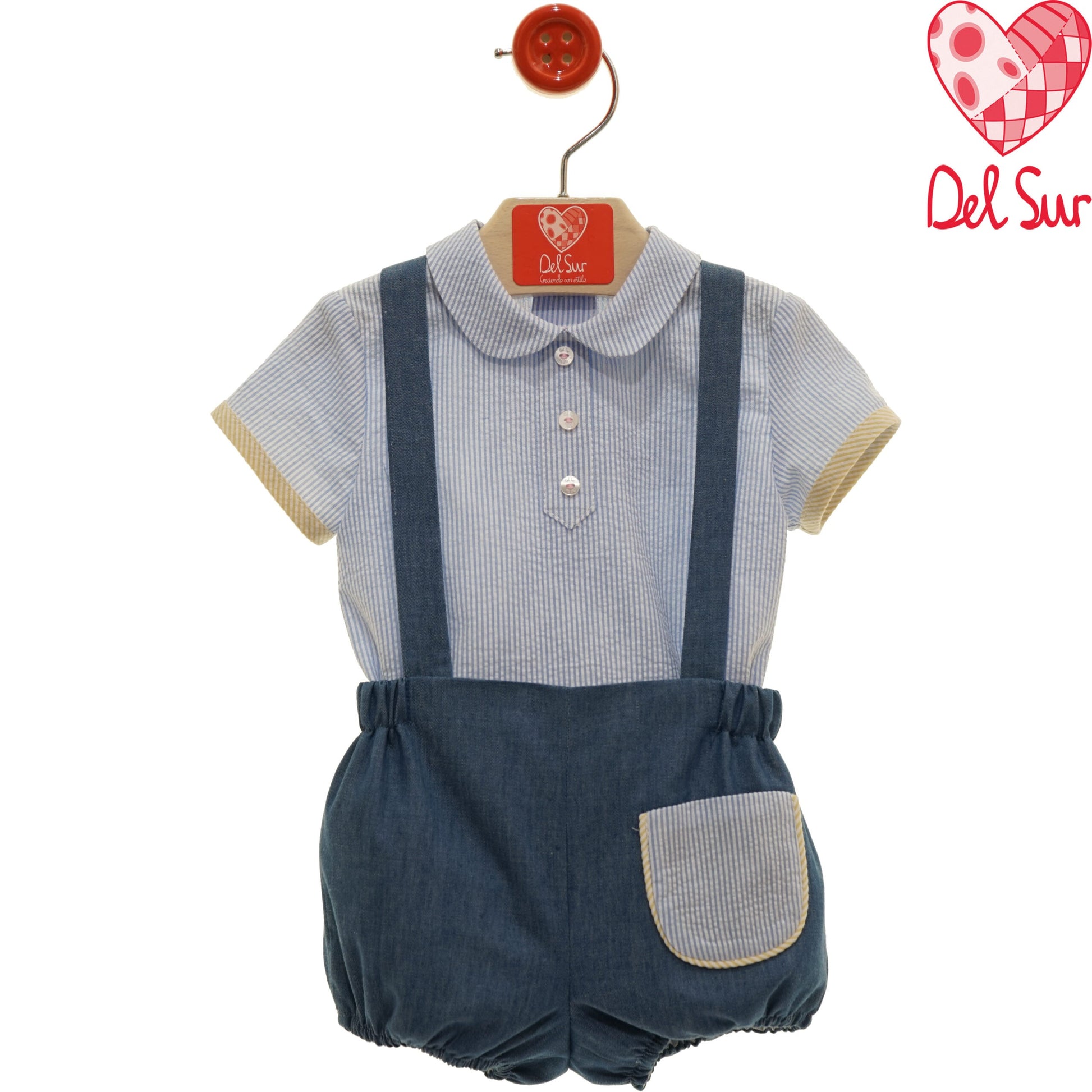 Pantalón en tejido denim con tirantes y decorado con un bolsillo.