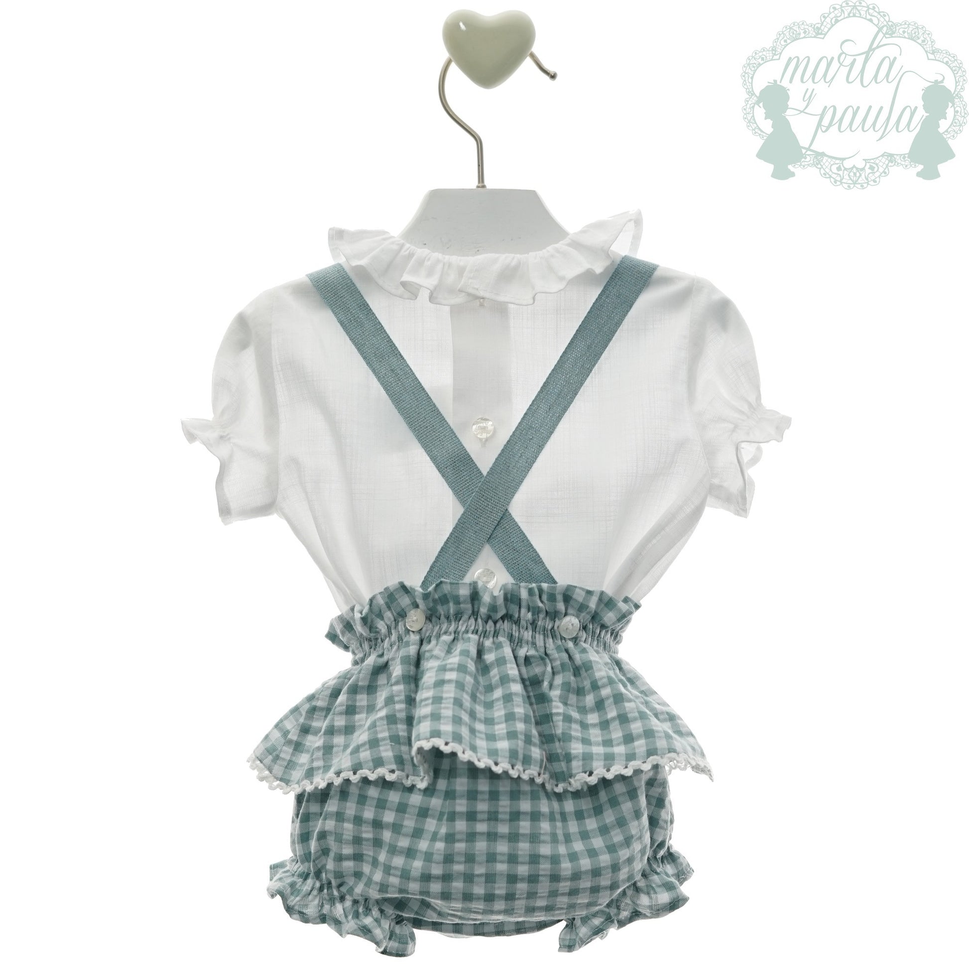 Conjunto de camisa de manga corta y faldita con tirantes en print de cuadro vichy verde.