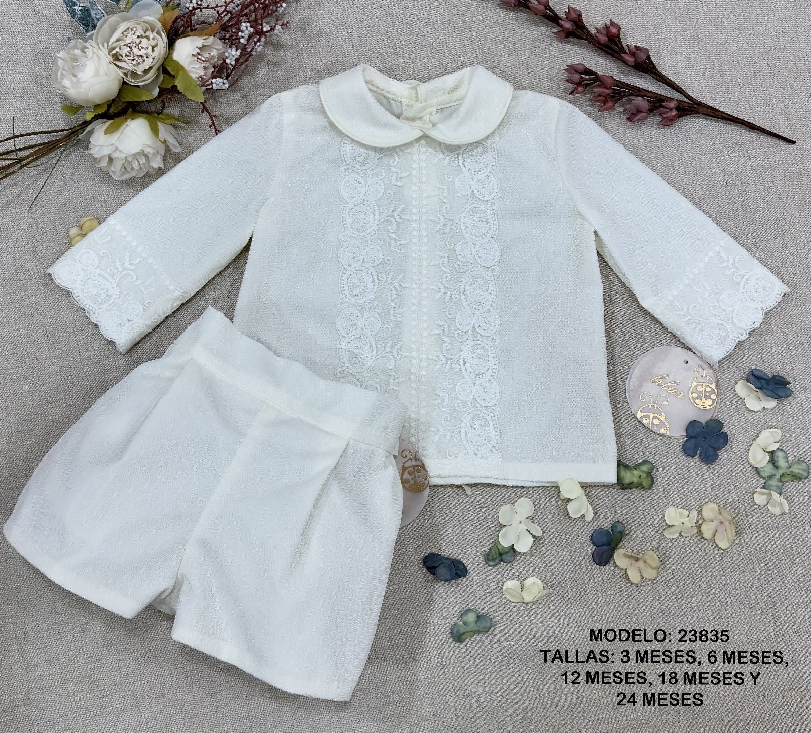 La camisa lleva puntilla en el borde las mangas y en el frontal, lleva cuello bebé.