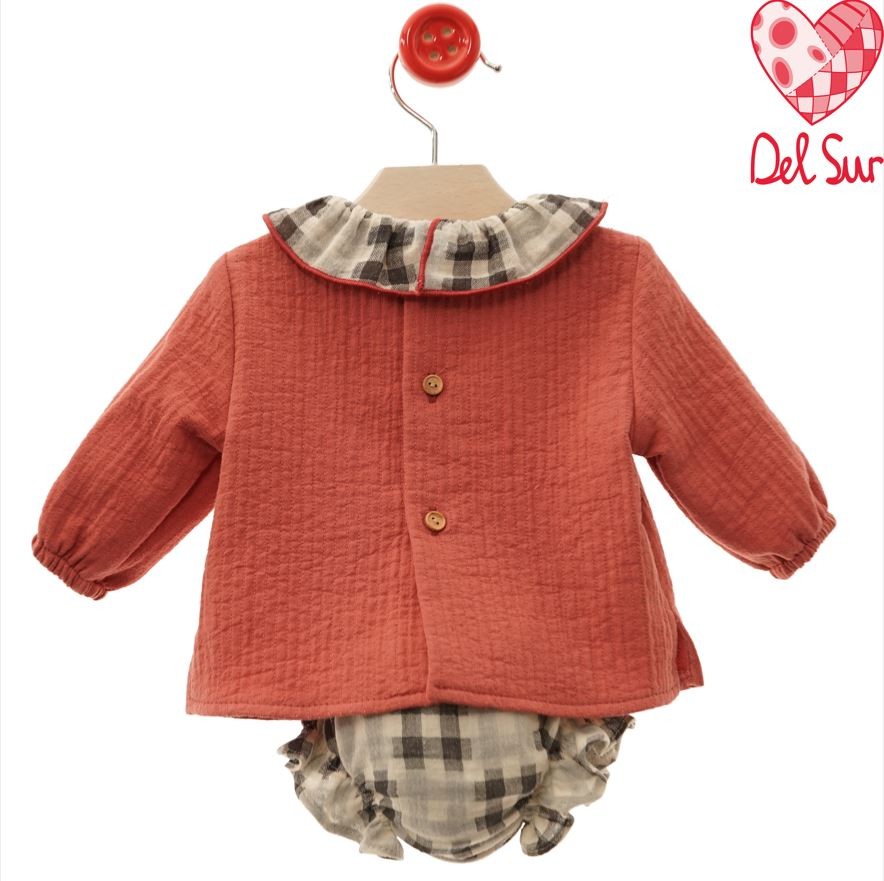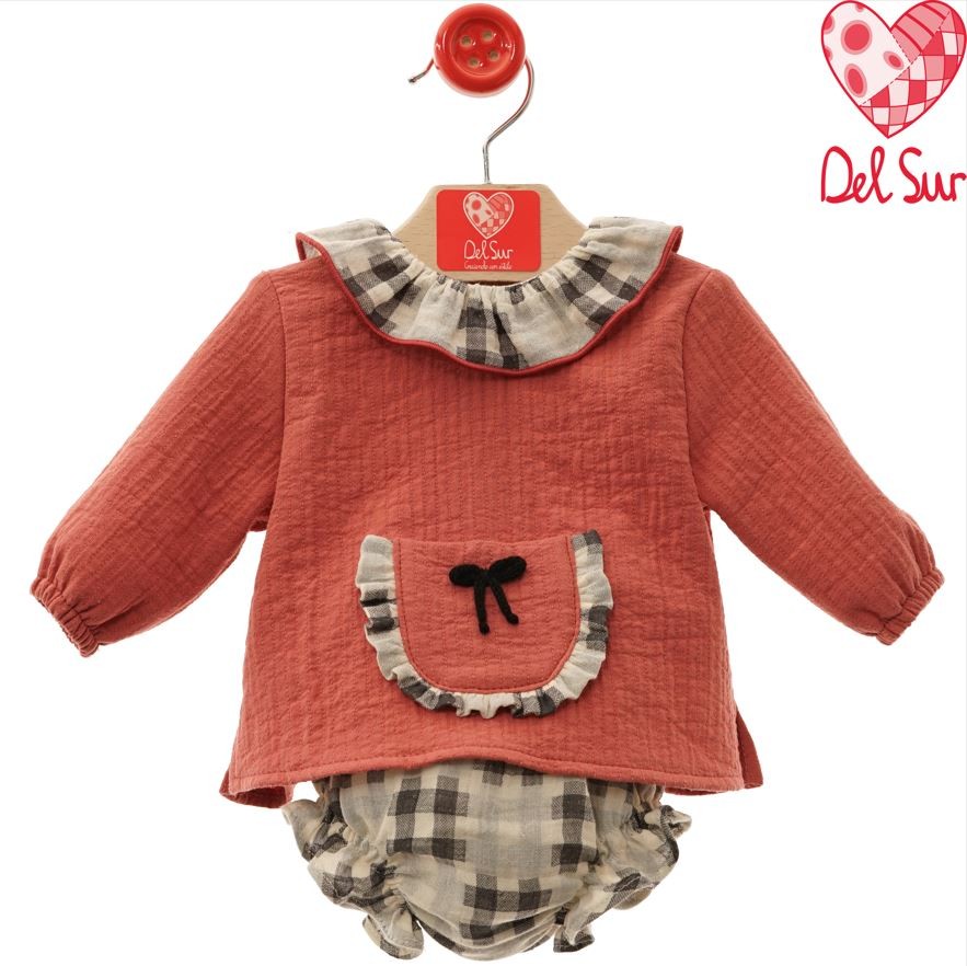 Este conjunto para bebé niña combina estilo y comodidad en dos piezas cuidadosamente diseñadas. El jersey, en un elegante tono coral, presenta un cuello y bolsillo a juego que aportan un detalle delicado y refinado. La braguita y el culotte corto complementan el conjunto con un estampado de cuadros grises, creando un contraste suave y armonioso. Fabricado en España con materiales de alta calidad, este conjunto asegura transpirabilidad y suavidad para la piel delicada del bebé, ideal para su uso diario o ocasiones especiales. Un balance perfecto entre diseño y funcionalidad que refleja tradición y cuidado artesanal.