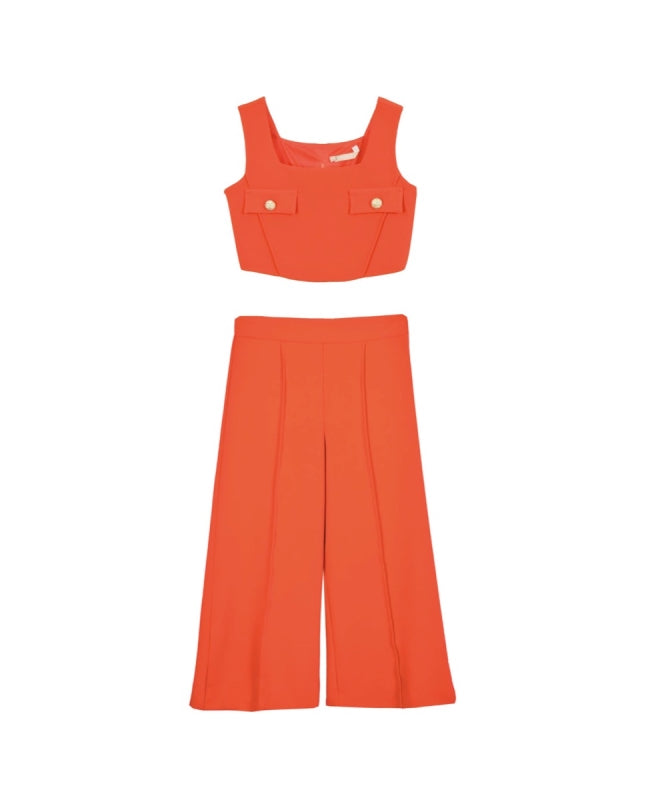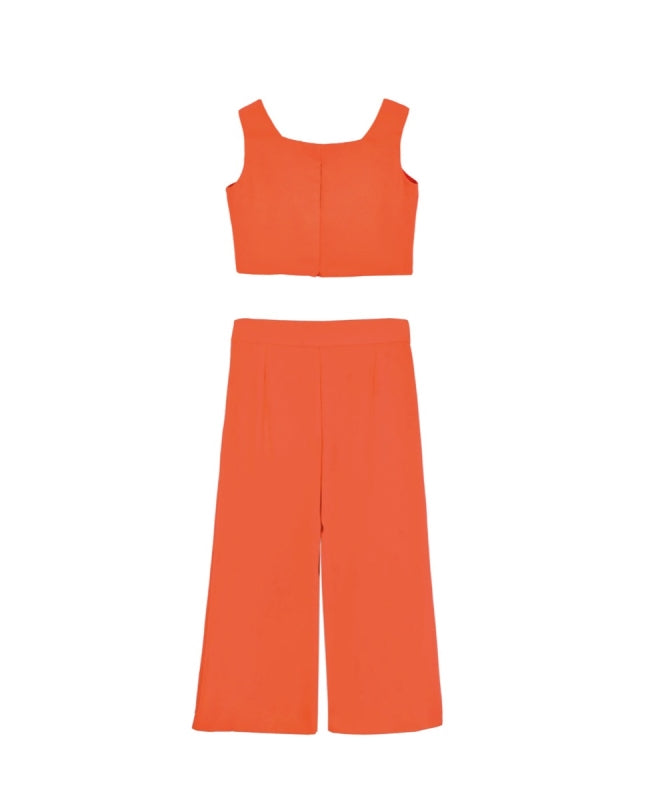 Conjunto de top escote cuadrado sin mangas y pantalón ancho coral donde destacan con nervios pespunteados desde el top hasta el pantalón