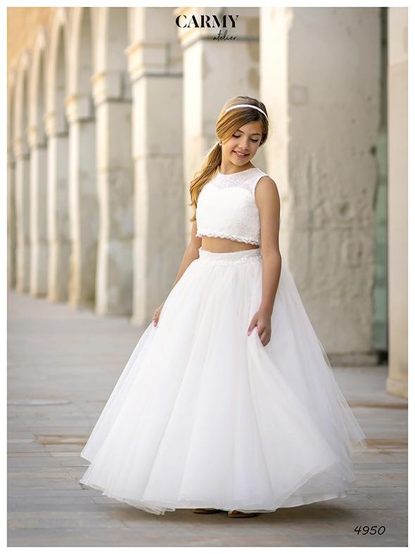 Vestido de dama de dos piezas, top y falda de la firma Carmy realizado en tul de color salmón claro. Opción de cambio de color, consulta por Whatsapp.