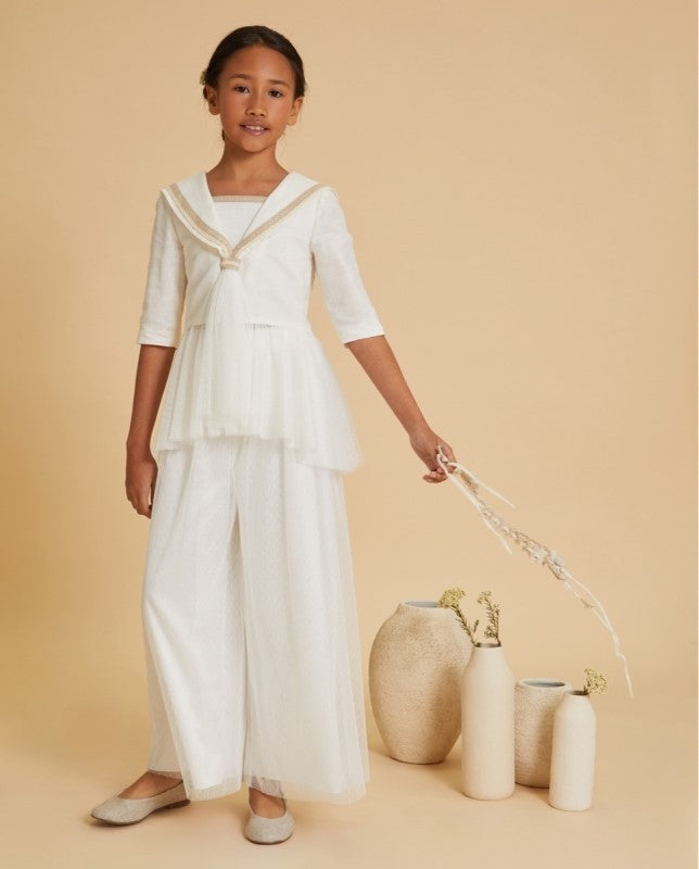 Conjunto de comunión romántico de la nueva colección 2025 de la firma Amaya Fashion for Kids. Elegante conjunto de top marinero y pantalón de comunión realizado en tejido de lino crudo con detalles en tostado.