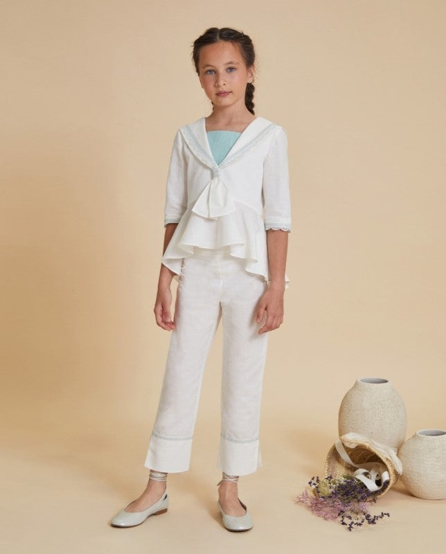 Conjunto de comunión romántico de la nueva colección 2025 de la firma Amaya Fashion for Kids. Elegante conjunto de top marinero y pantalón de comunión realizado en tejido de lino crudo con detalles en verde agua.