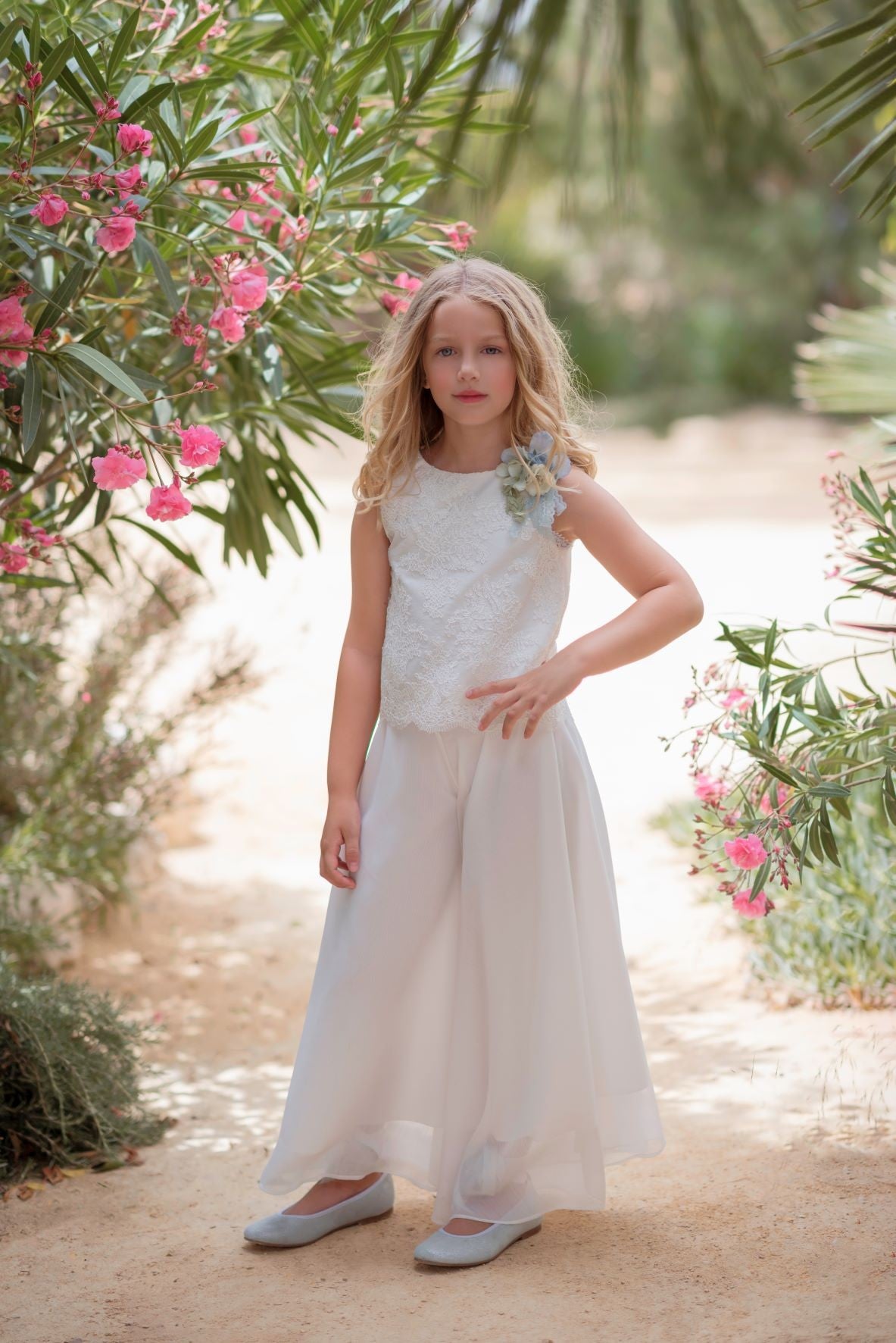 Elegante conjunto de comunión, realizado en tejido de tul bordado y chiffon.