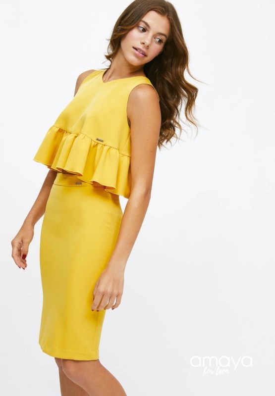 Conjunto de falda midi y top para niña juvenil de Ceremonia que pertenece a la nueva colección de Primavera Verano de la firma Amaya Fashion for Kids, confeccionado en tejido de creepe.