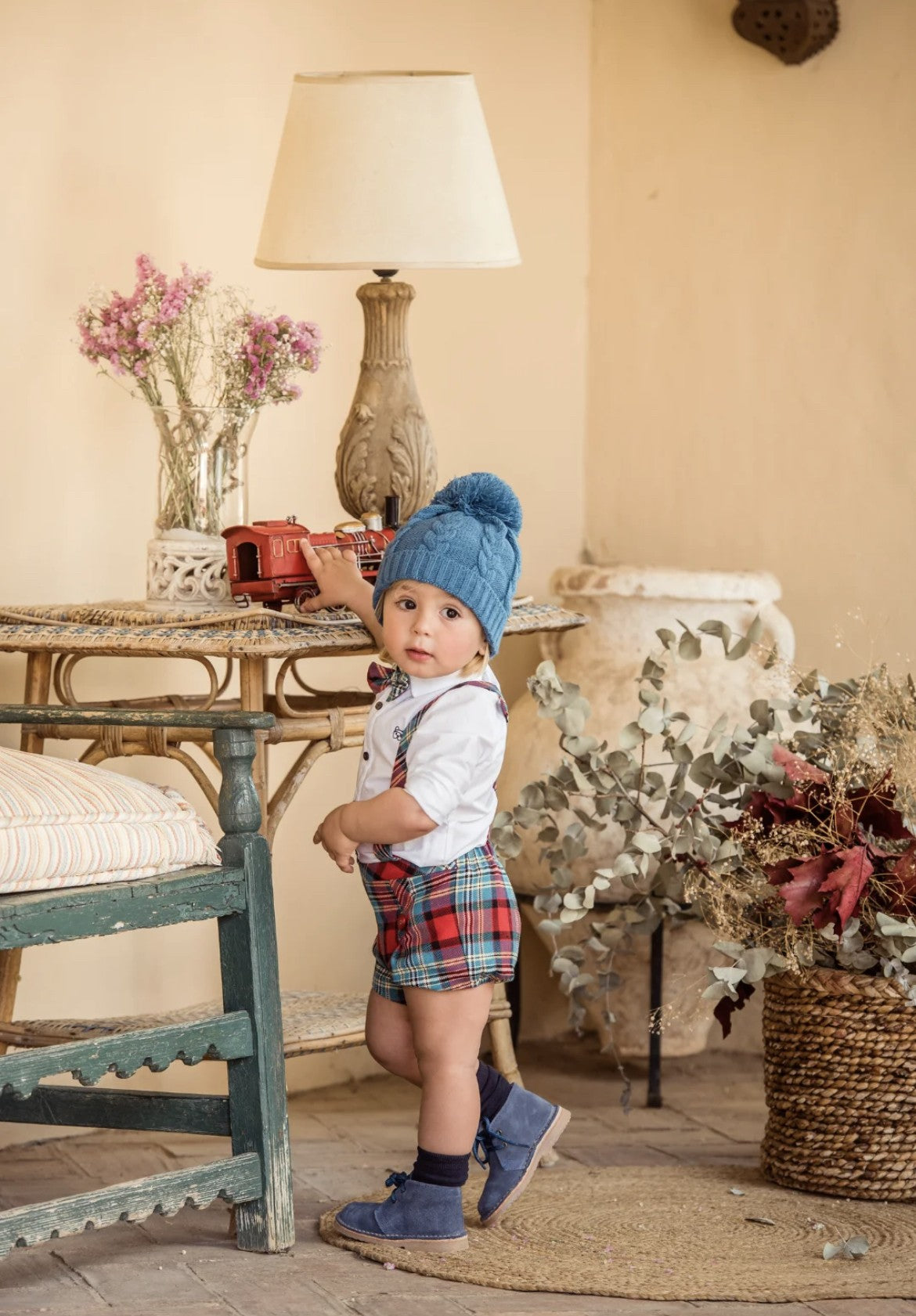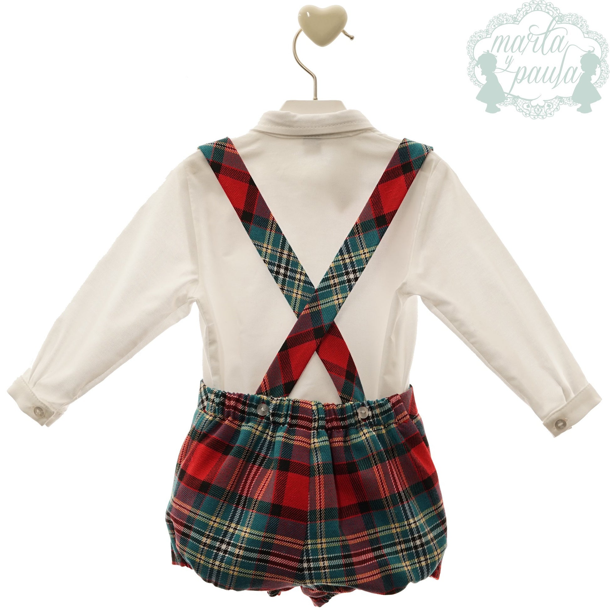 Conjunto de camisa blanca con detalles y el pantalón en tartán azul con detalles en rojo. Tirantes y pajarita estampados a juego.