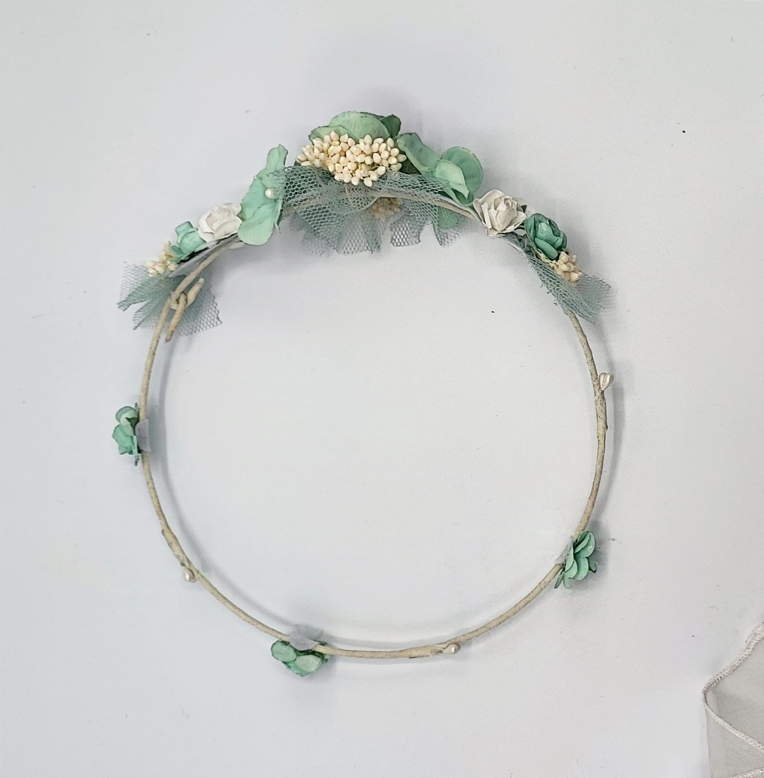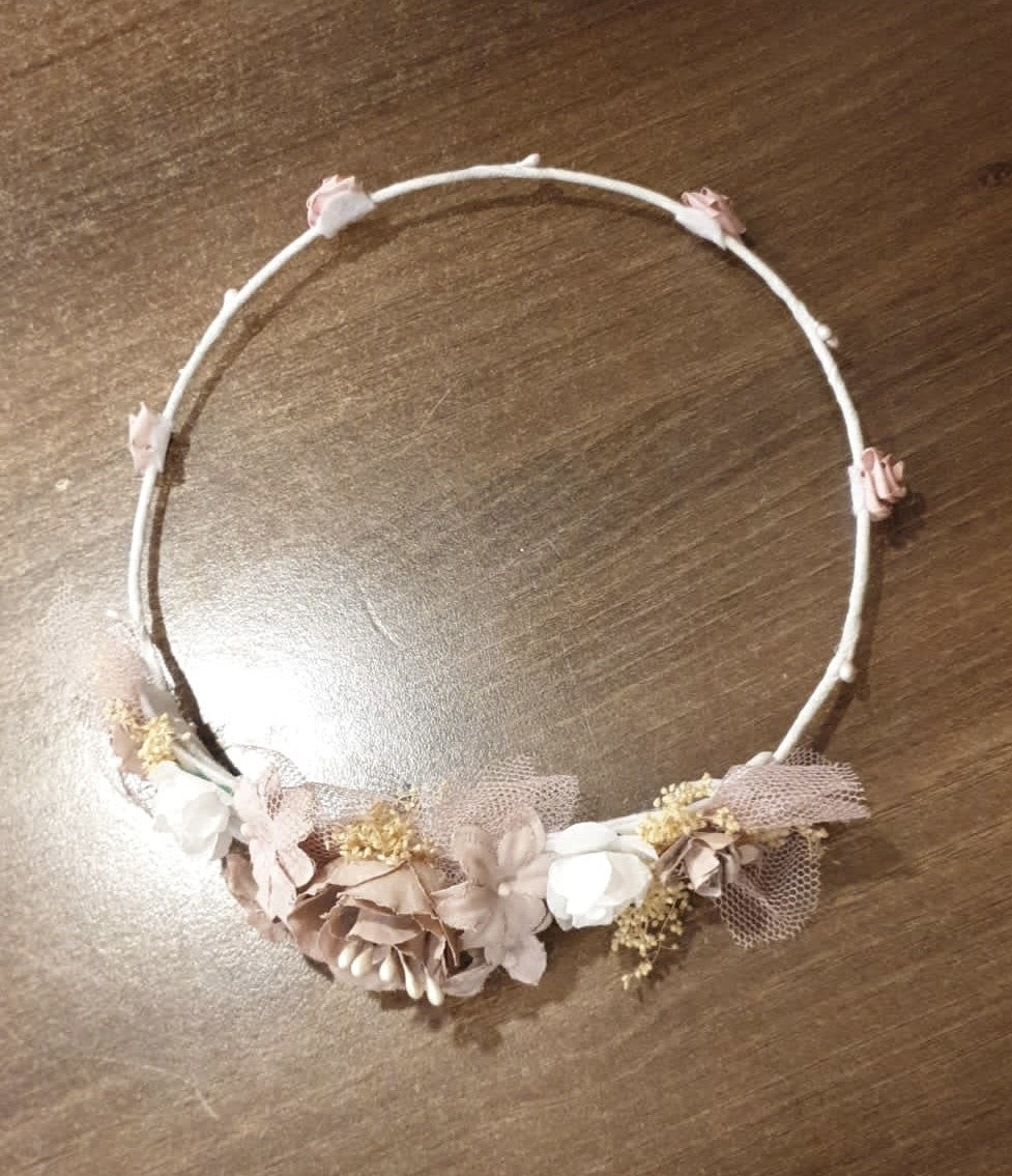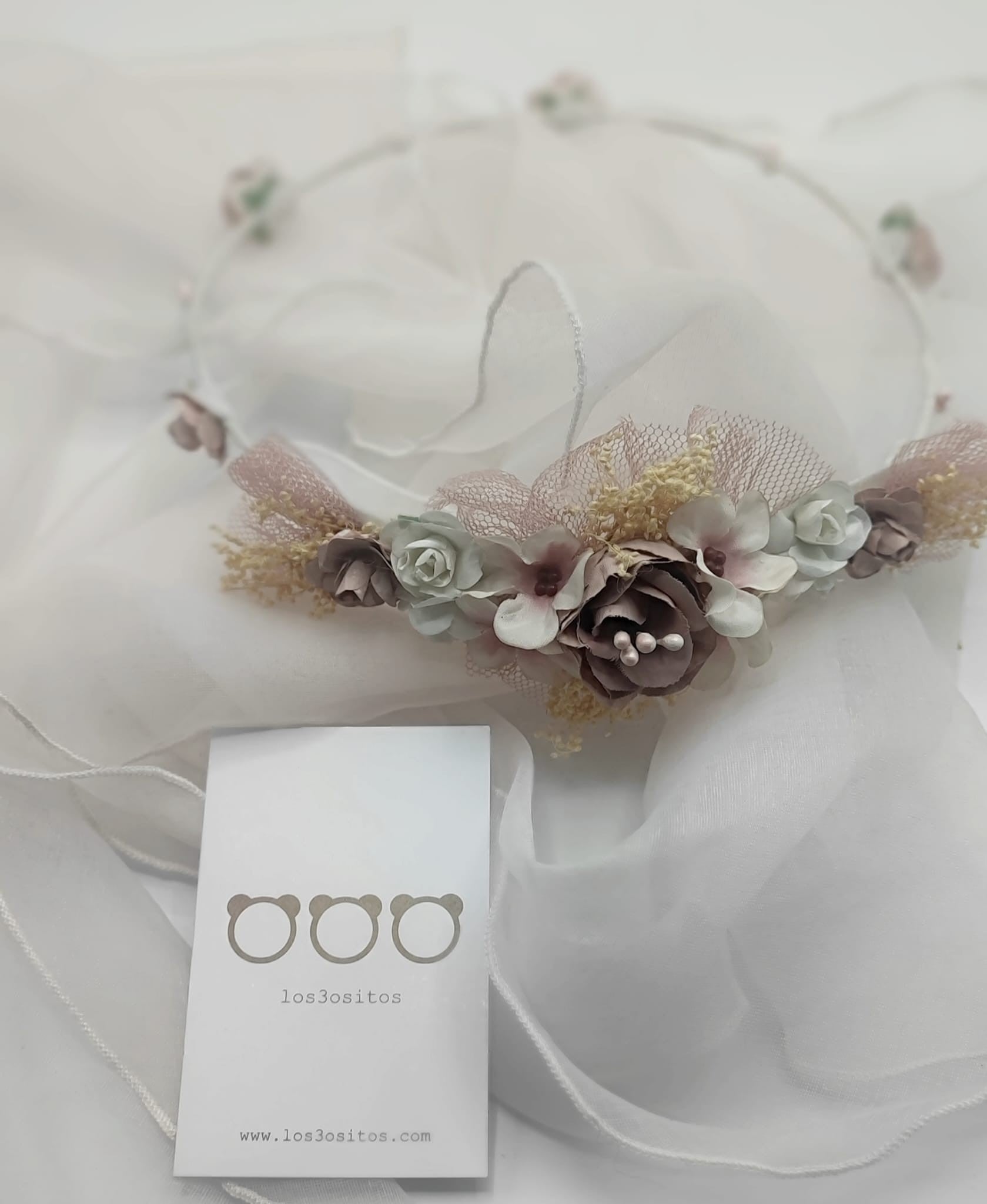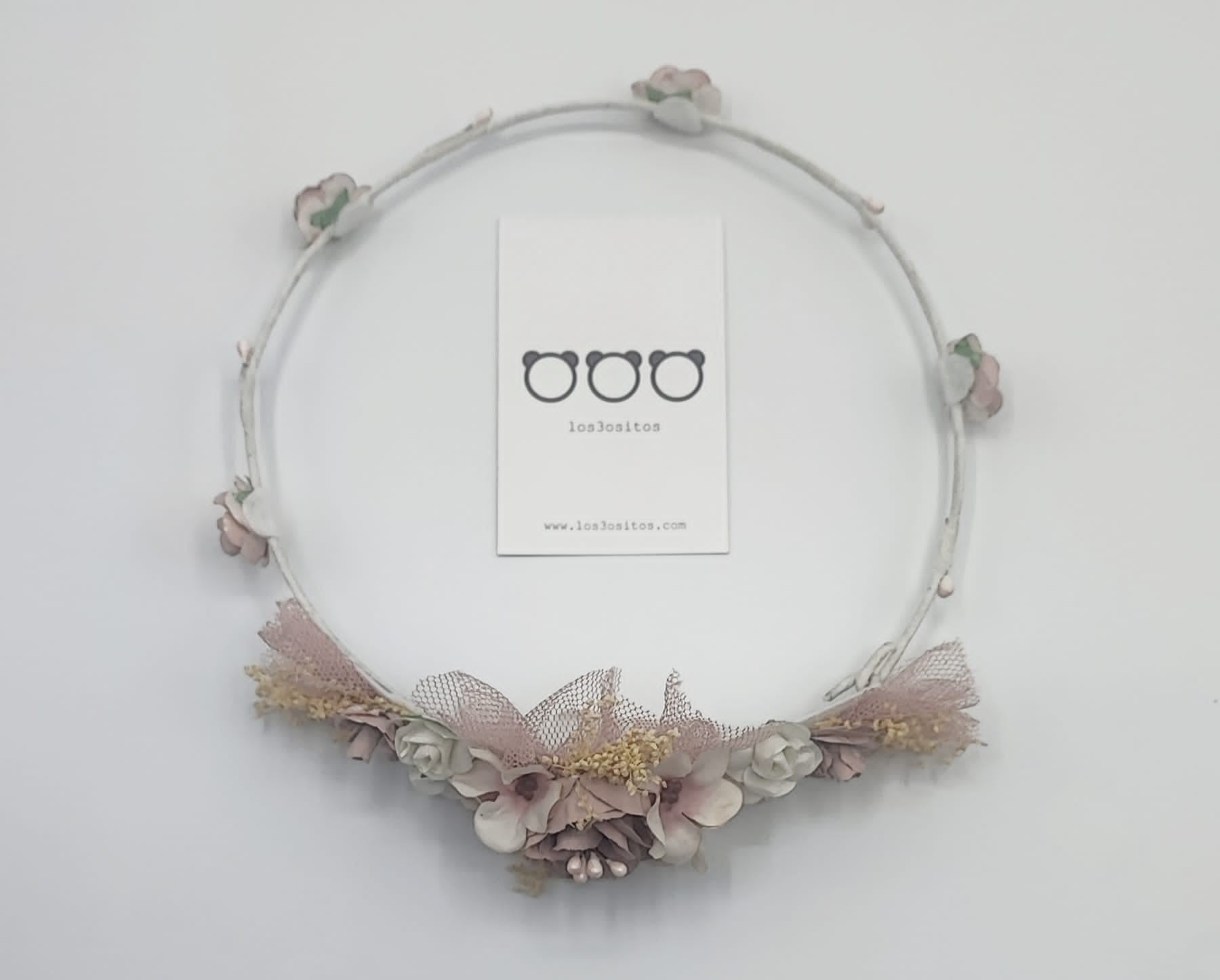 La corona floral compuesta de flores hechas a mano ideal para combinar con Vestido de comunión o arras.