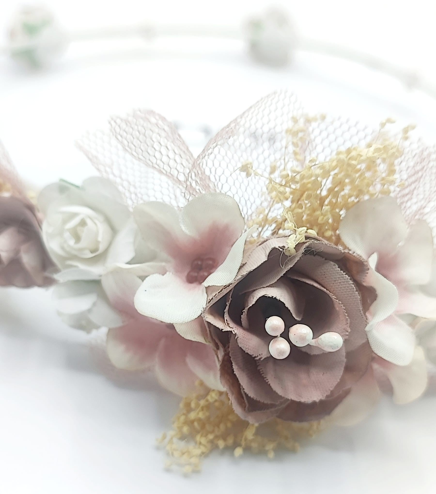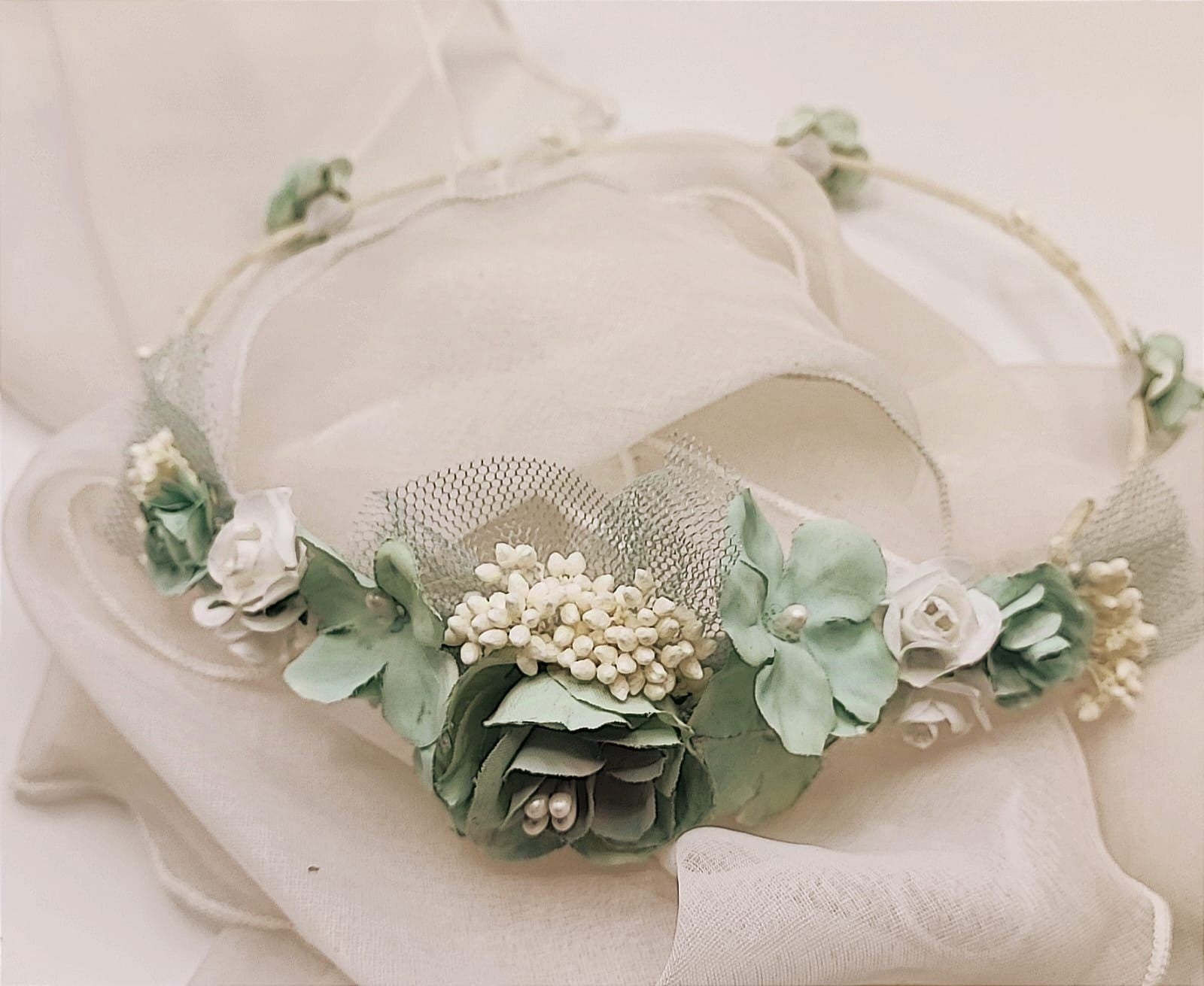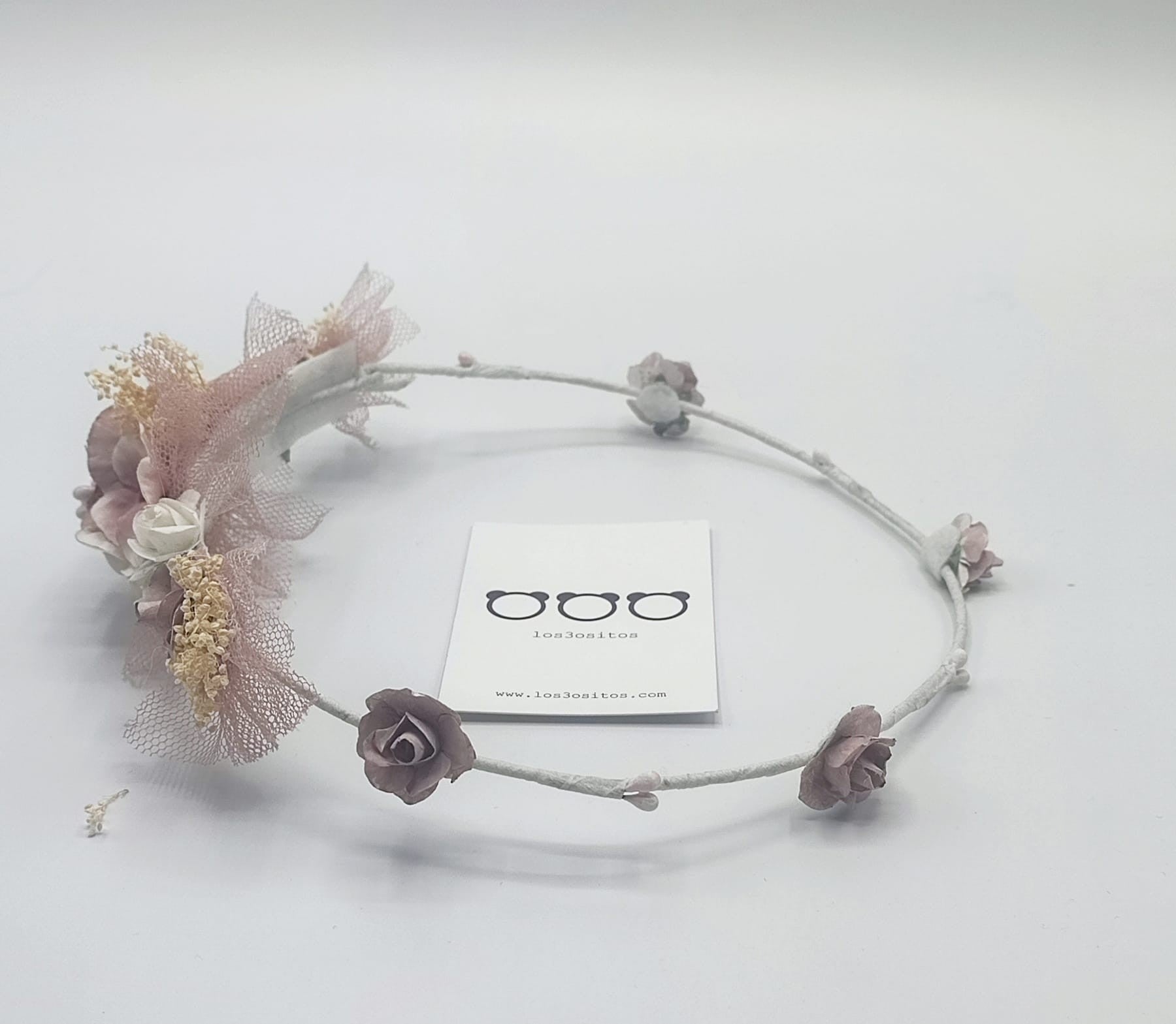 La corona floral compuesta de flores hechas a mano ideal para combinar con Vestido de comunión o arras.