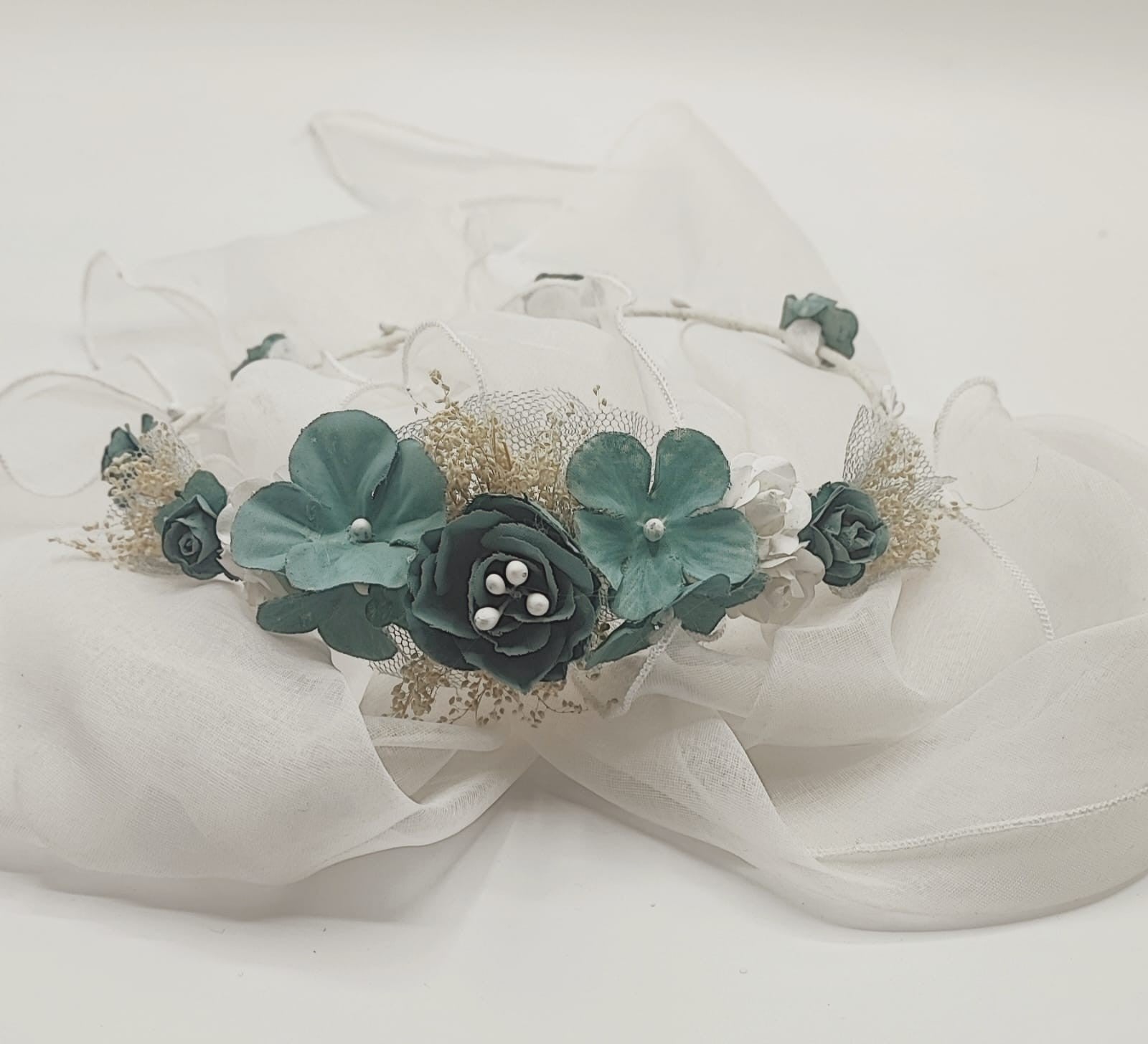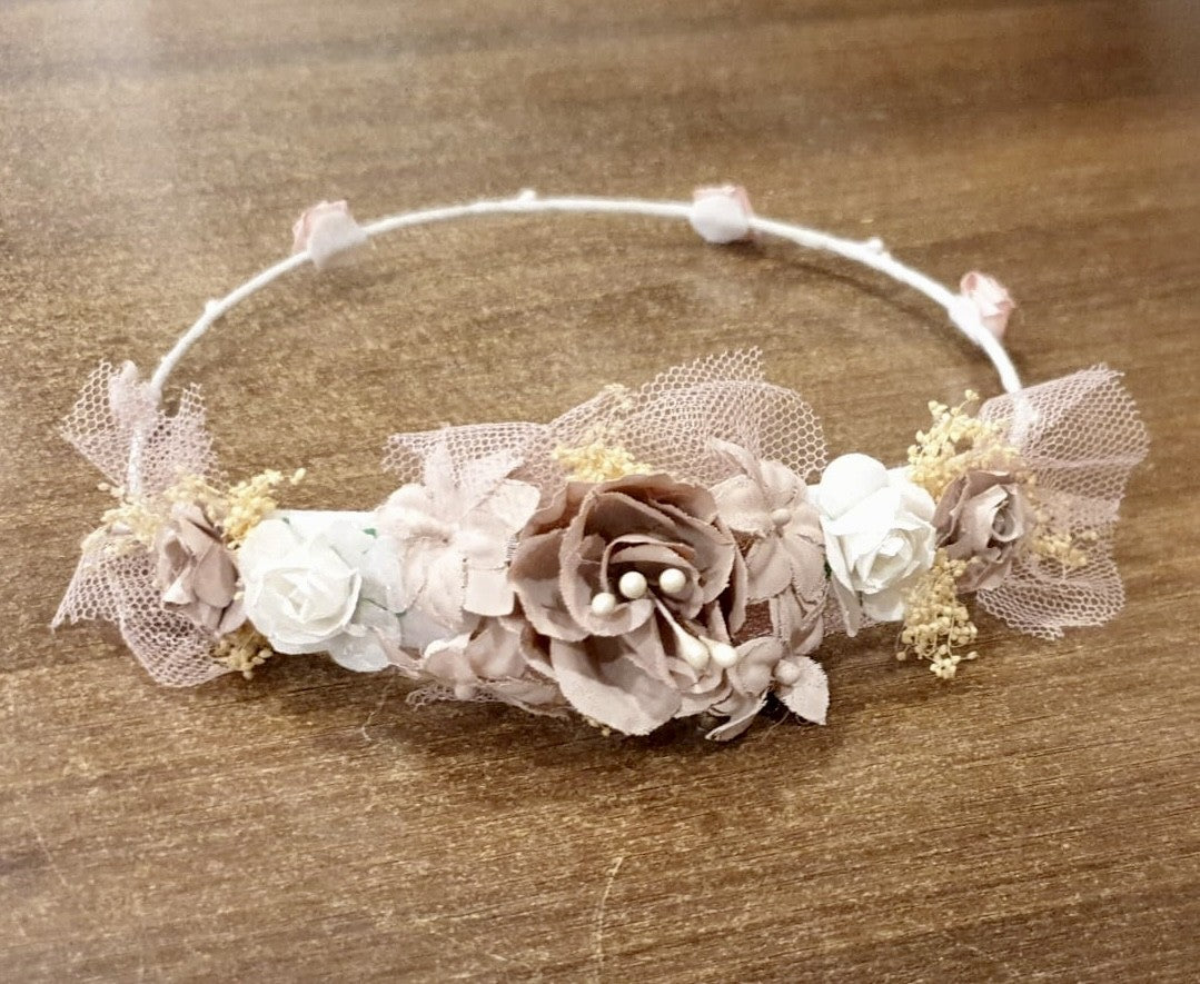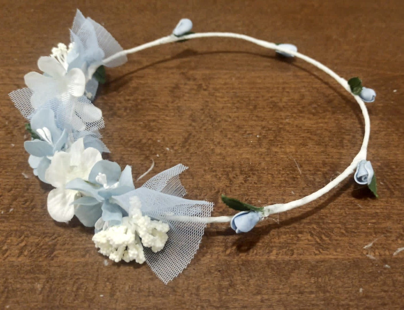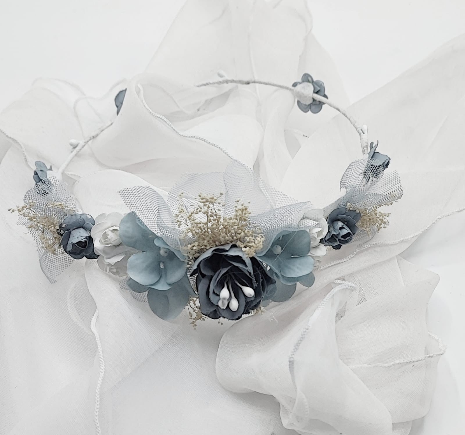 La corona floral compuesta de flores hechas a mano ideal para combinar con Vestido de comunión o arras.