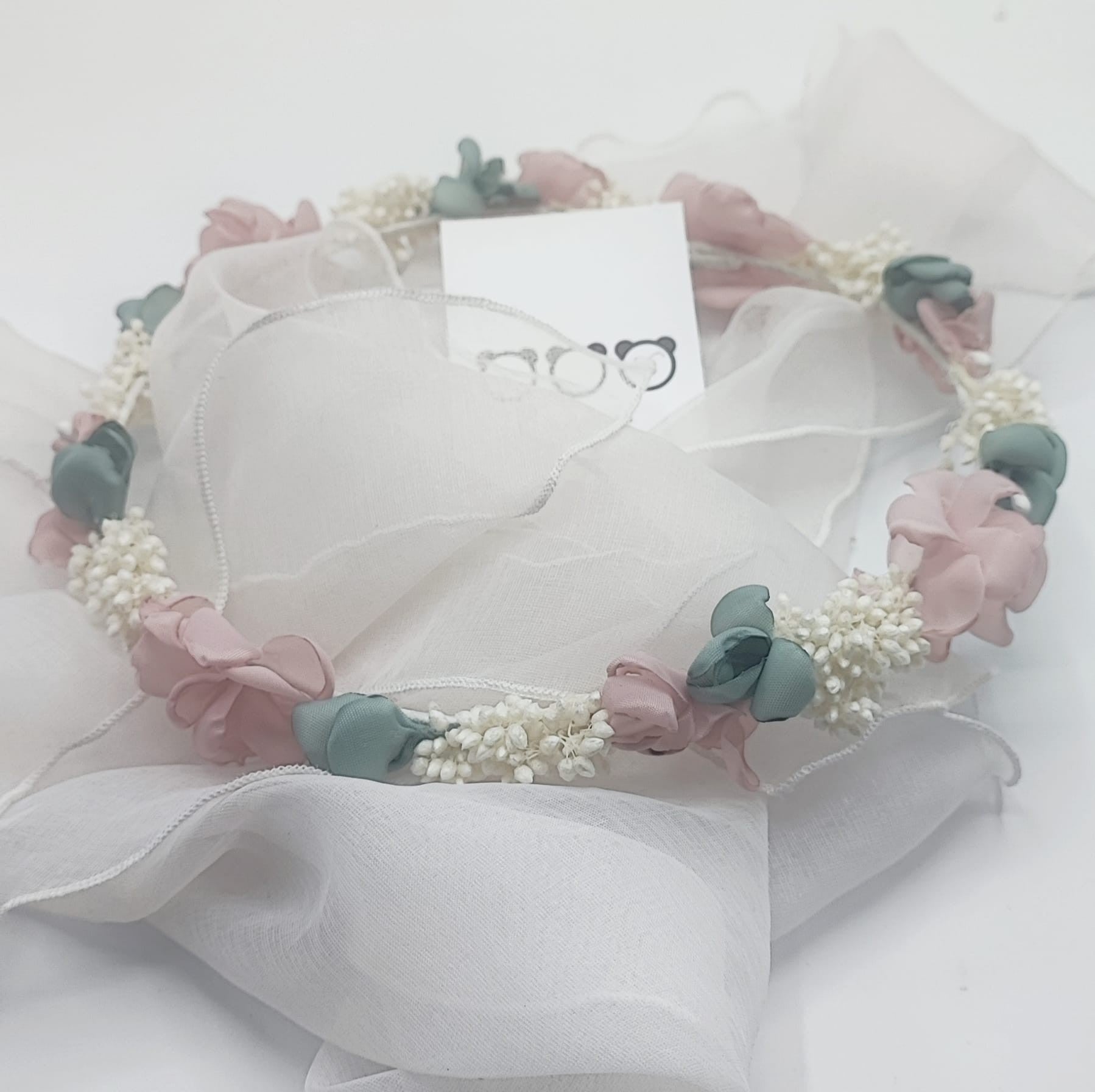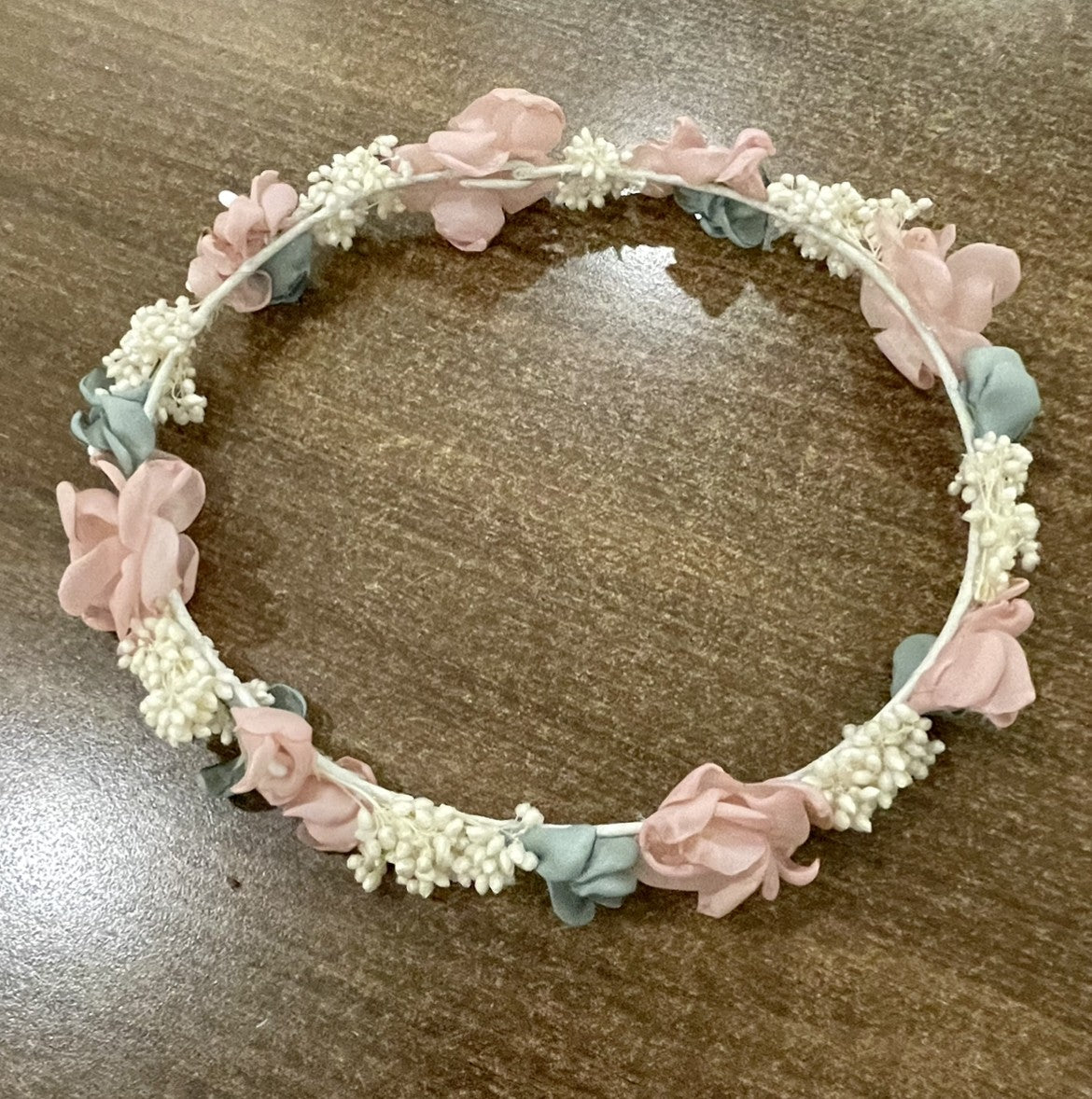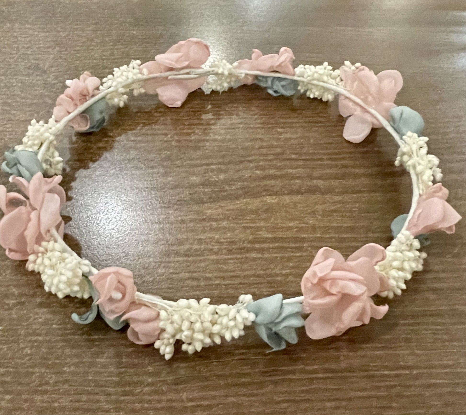 Corona de flores para ceremonia de Los3ositos realizada con flores secas y flores de tela combinadas.