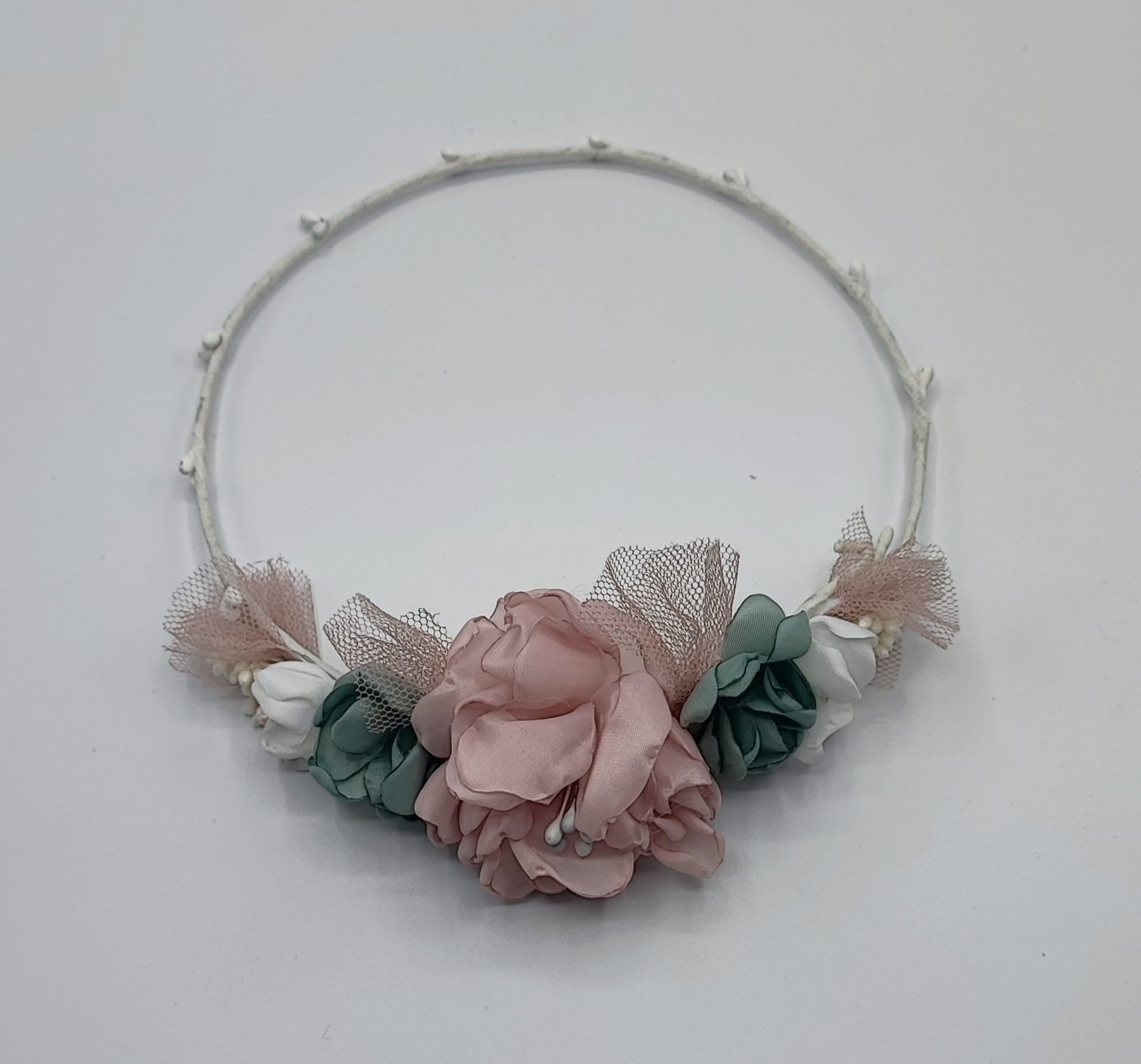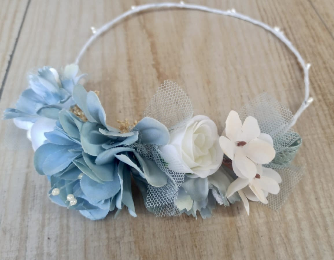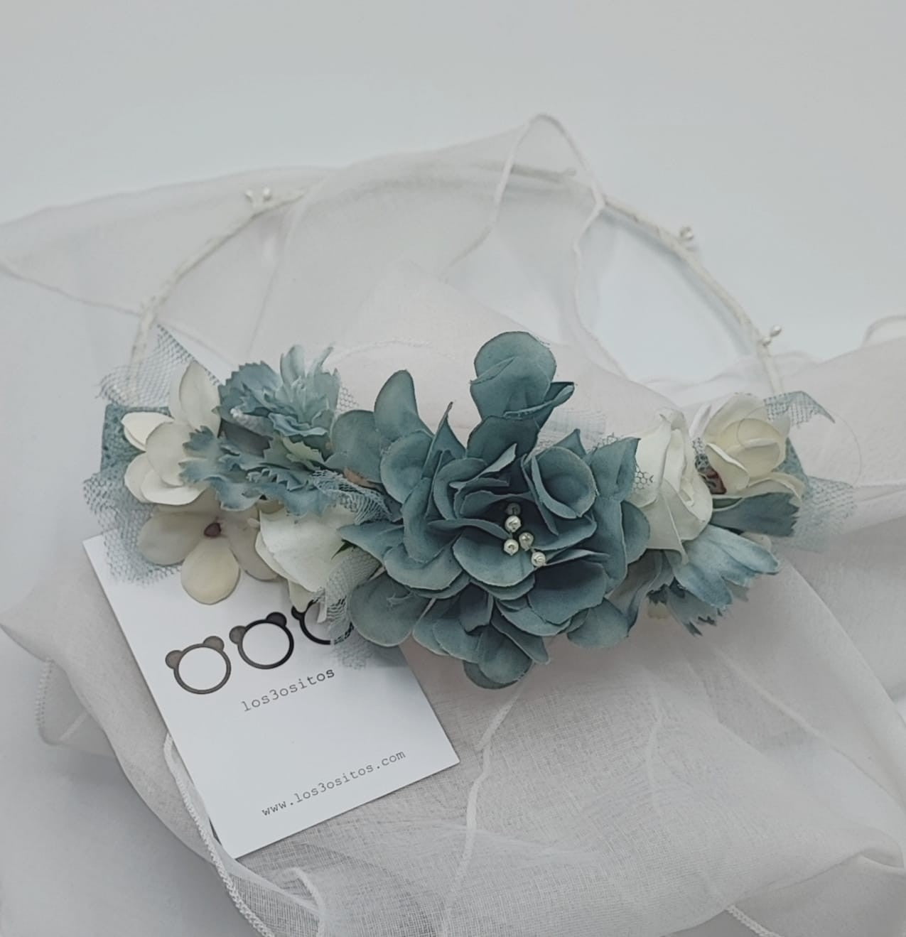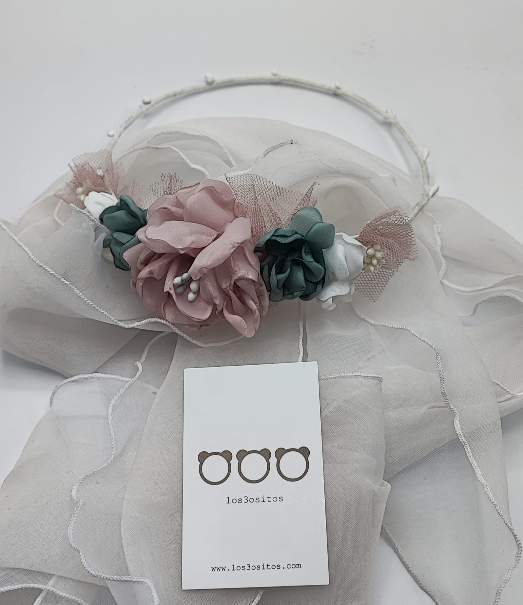 La corona floral compuesta de flores hechas a mano ideal para combinar con Vestido de comunión o arras.