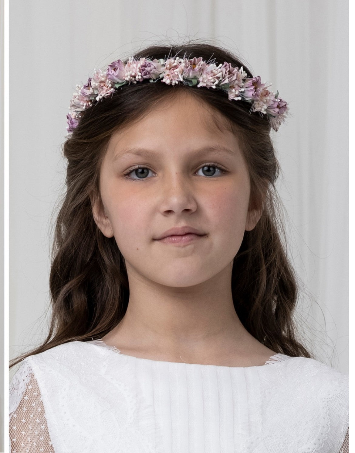 Corona con pequeñas flores delanteras y con lazada en la parte posterior