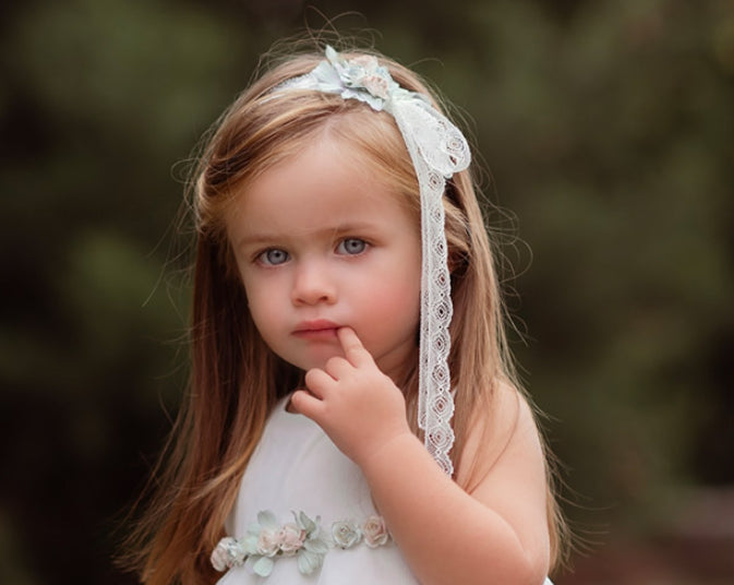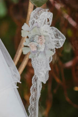 Diadema flexible fabricada con puntillas a juego con el vestido 327 de Mimilú.