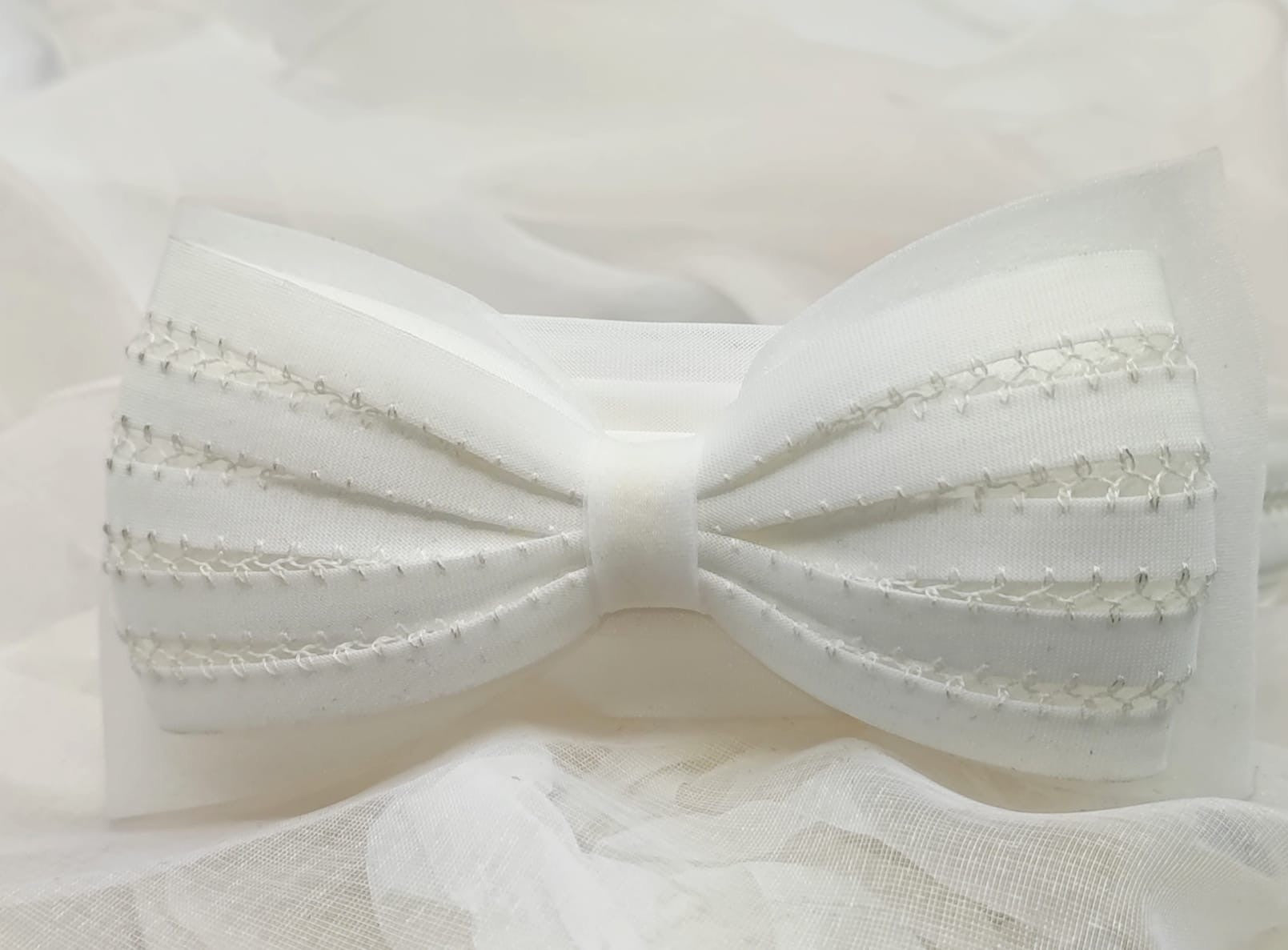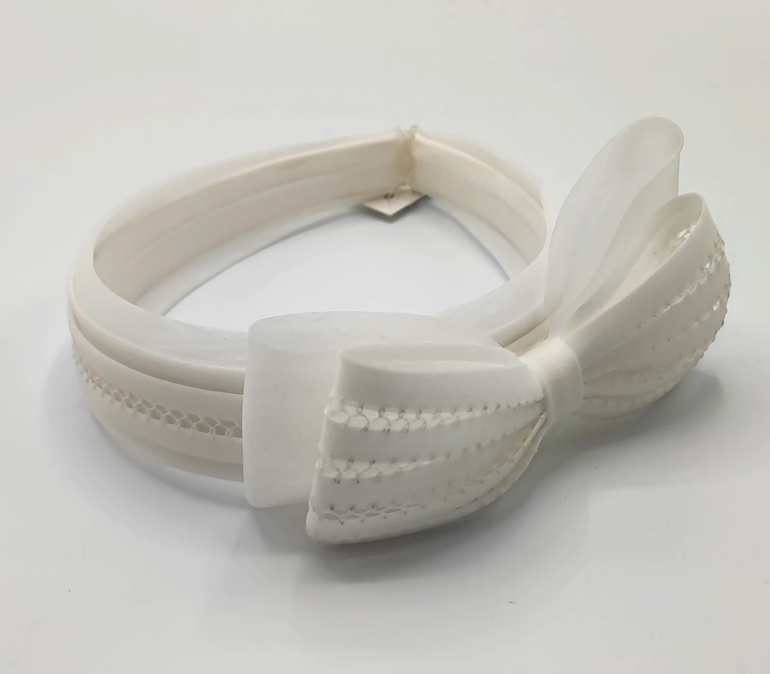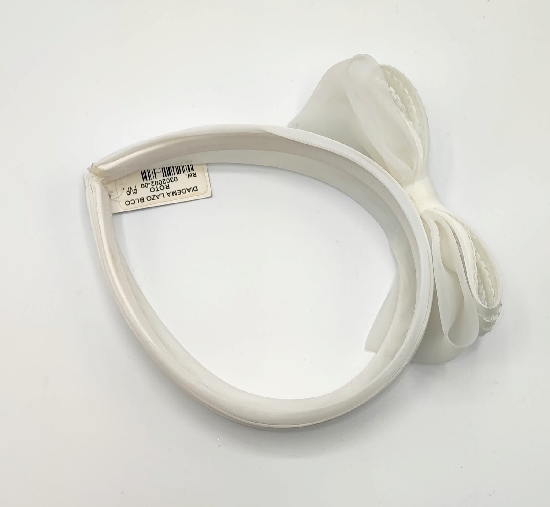 Diadema ancha de comunión en tono blanco roto, decorada con vainicas y lazo zapatero doble.