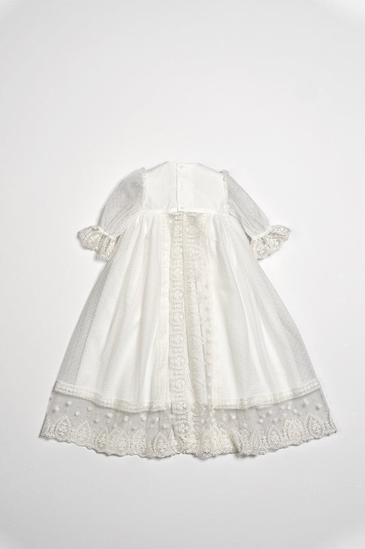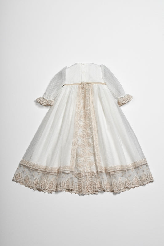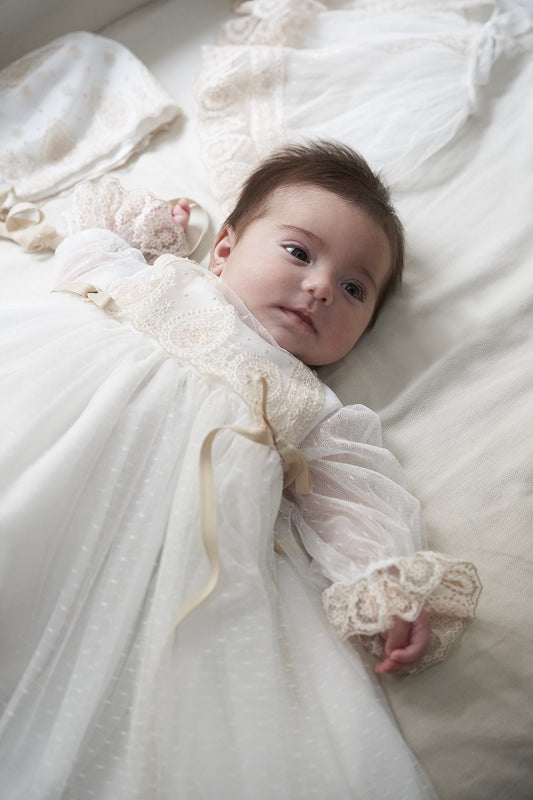 Faldón de bautizo de 3 piezas Huve que combina elegancia tradicional con detalles artesanales. El conjunto incluye capota, faldón y cubre pañal, todos ellos confeccionados en tul plumeti crudo con puntillas contrastadas y acabados en tonos tostados que aportan calidez y sofisticación. Las cintas en lazadas añaden un toque de distinción característica de la moda infantil clásica.
