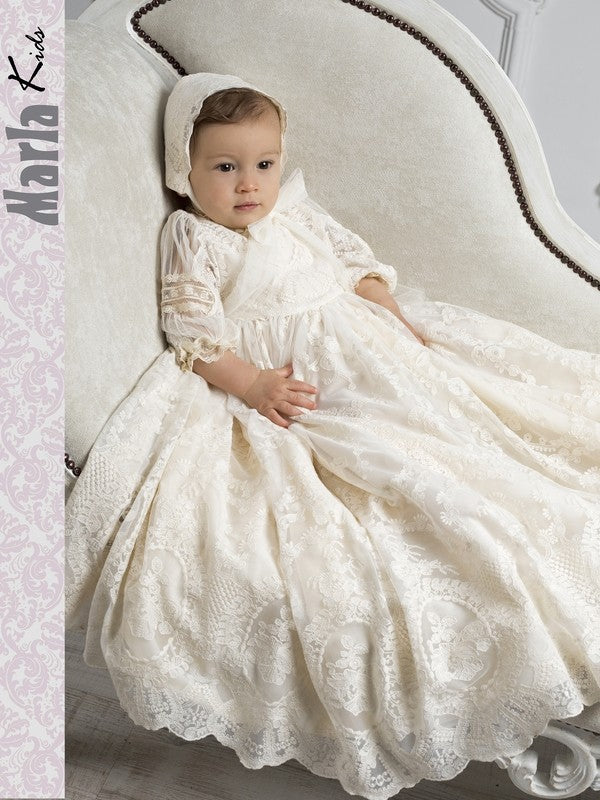 Cuerpo bordado con mangas al codo en precioso tul bordado y falda en tul acabado en preciosos bordados.