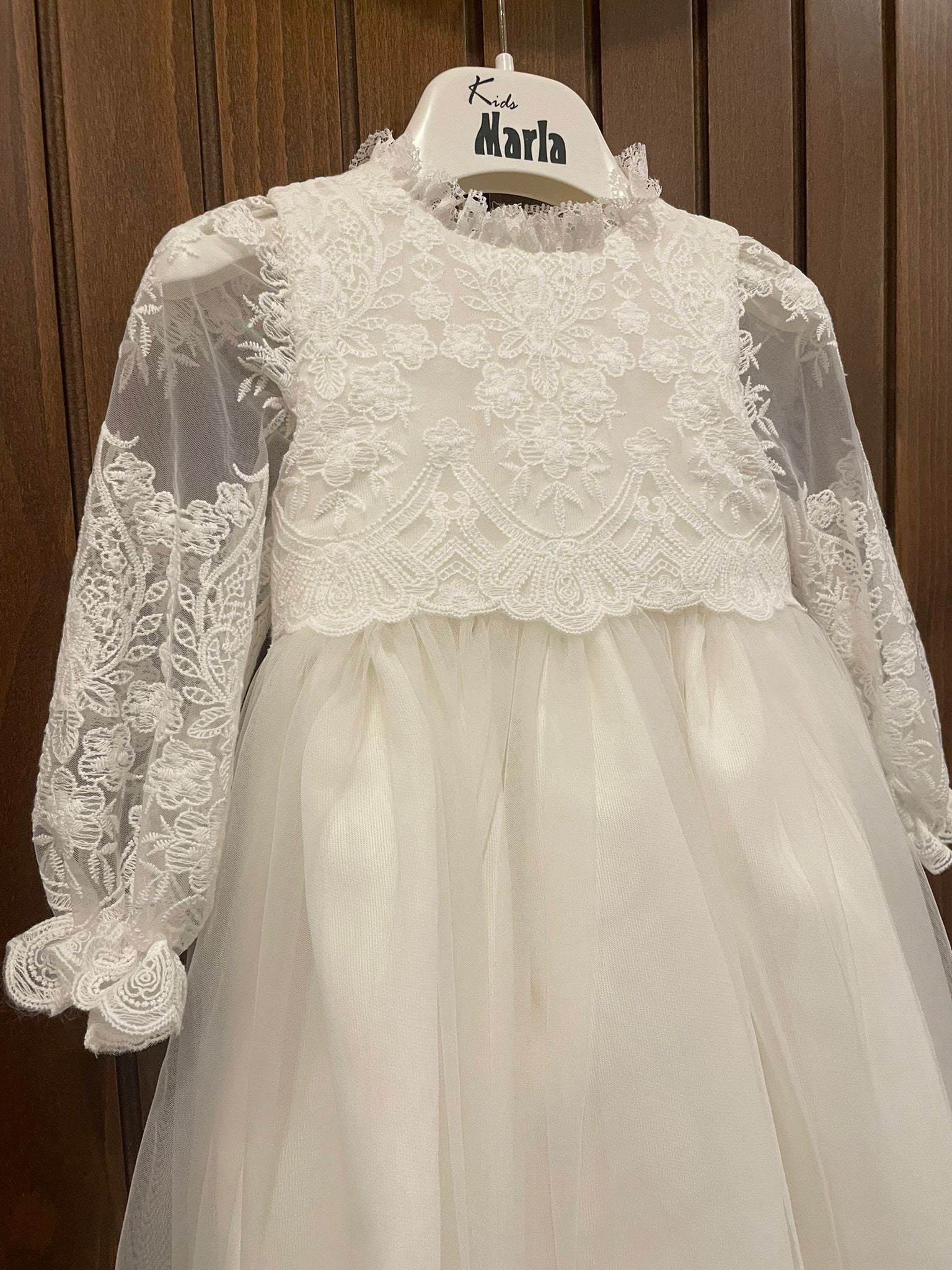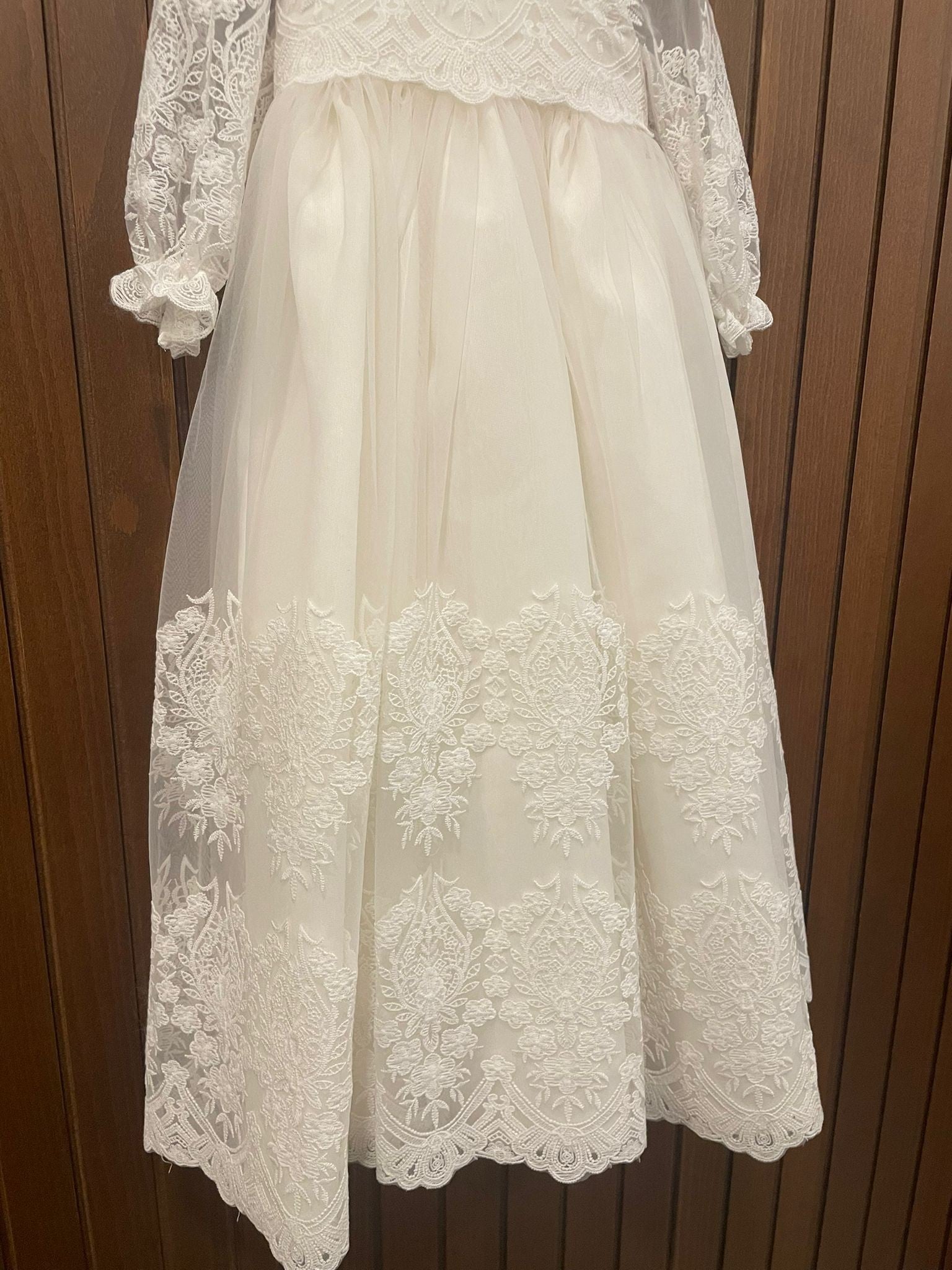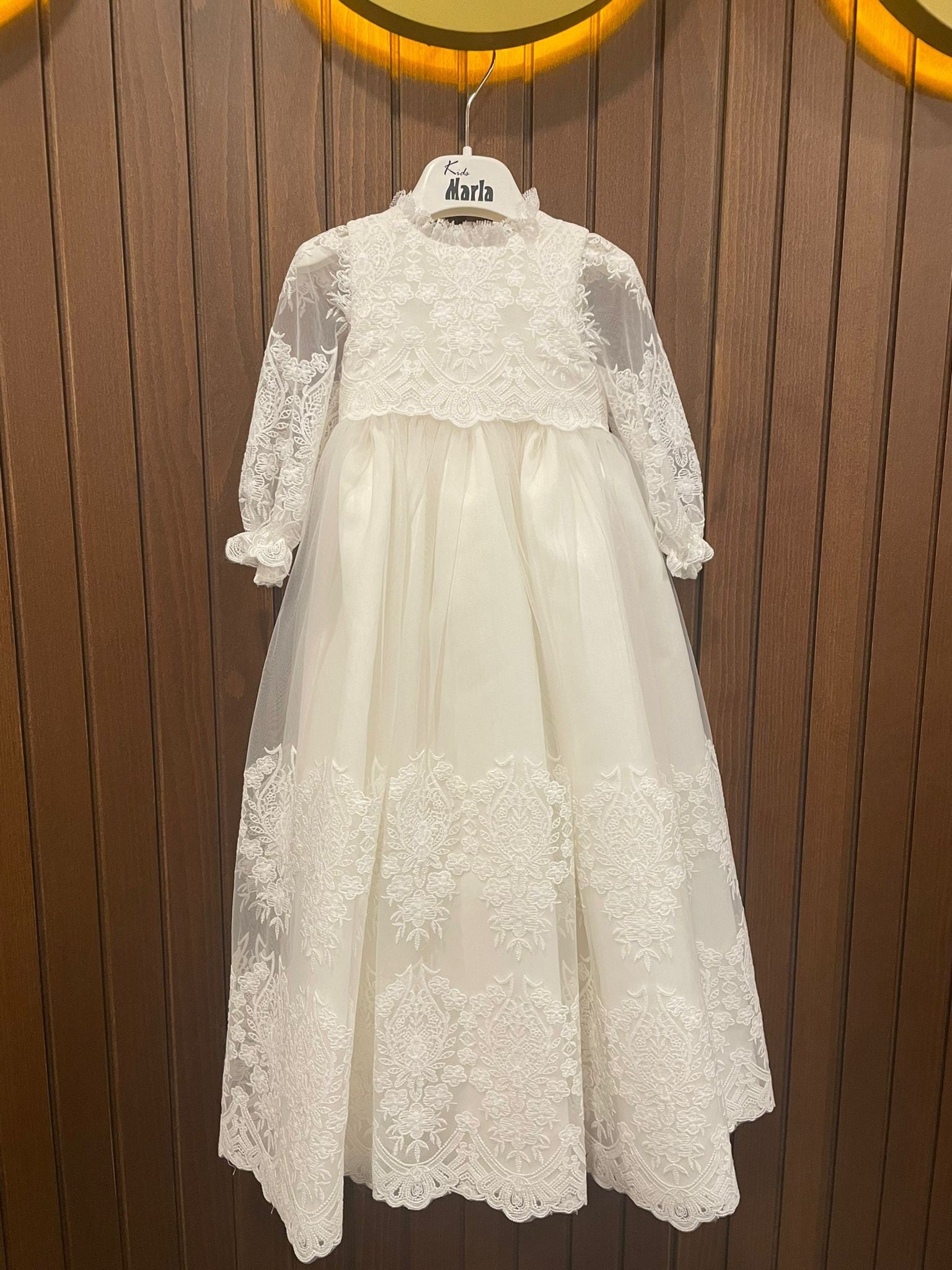 Cuerpo bordado con mangas al codo en precioso tul bordado y falda en tul acabado en preciosos bordados.
