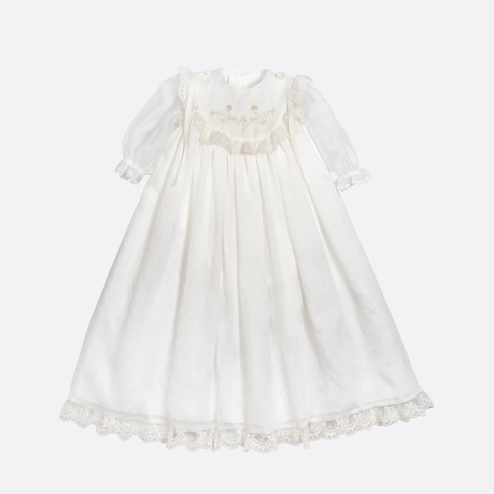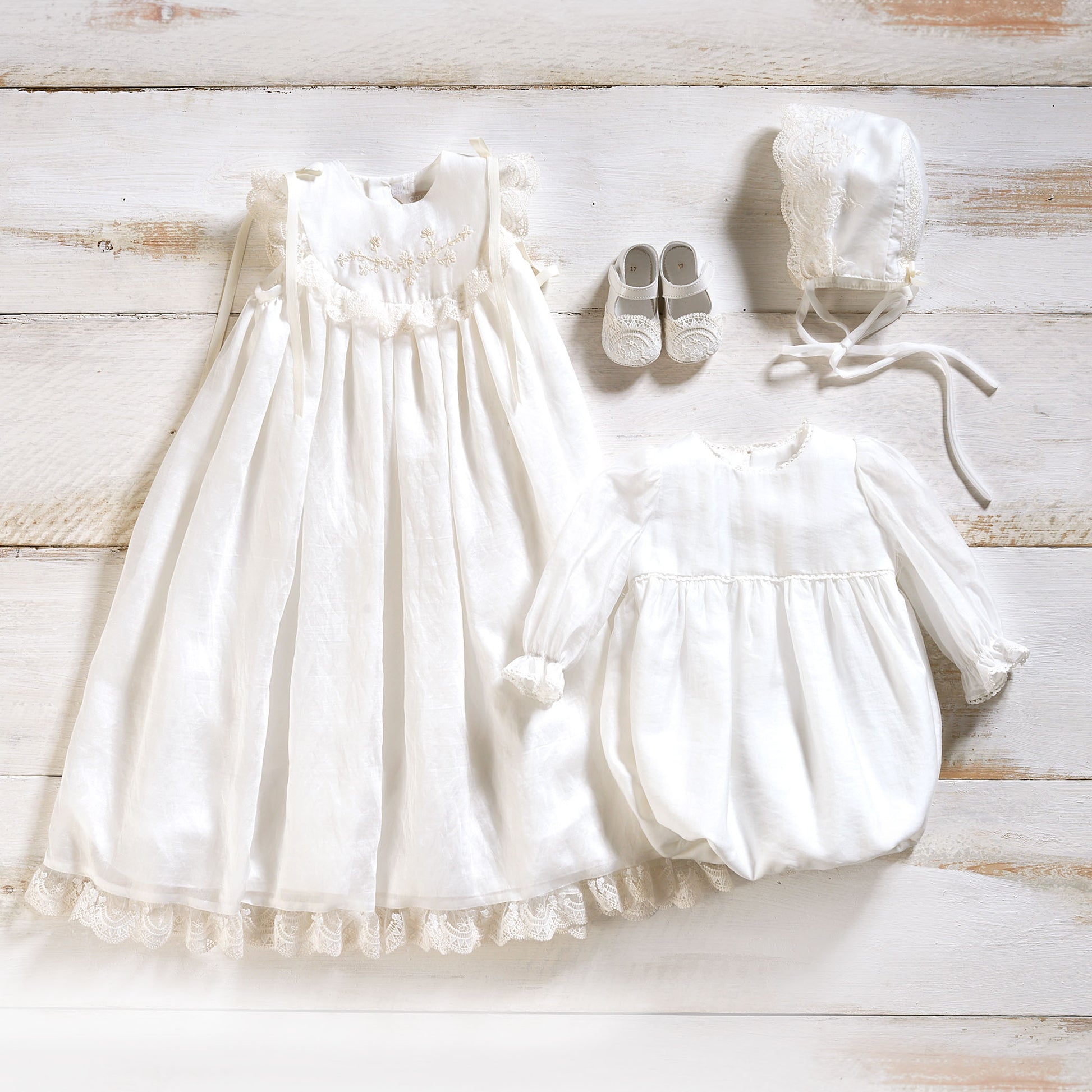 Nuestro faldón convertible en pelele de la colección Royal es una verdadera joya confeccionada en una suave muselina cruda.