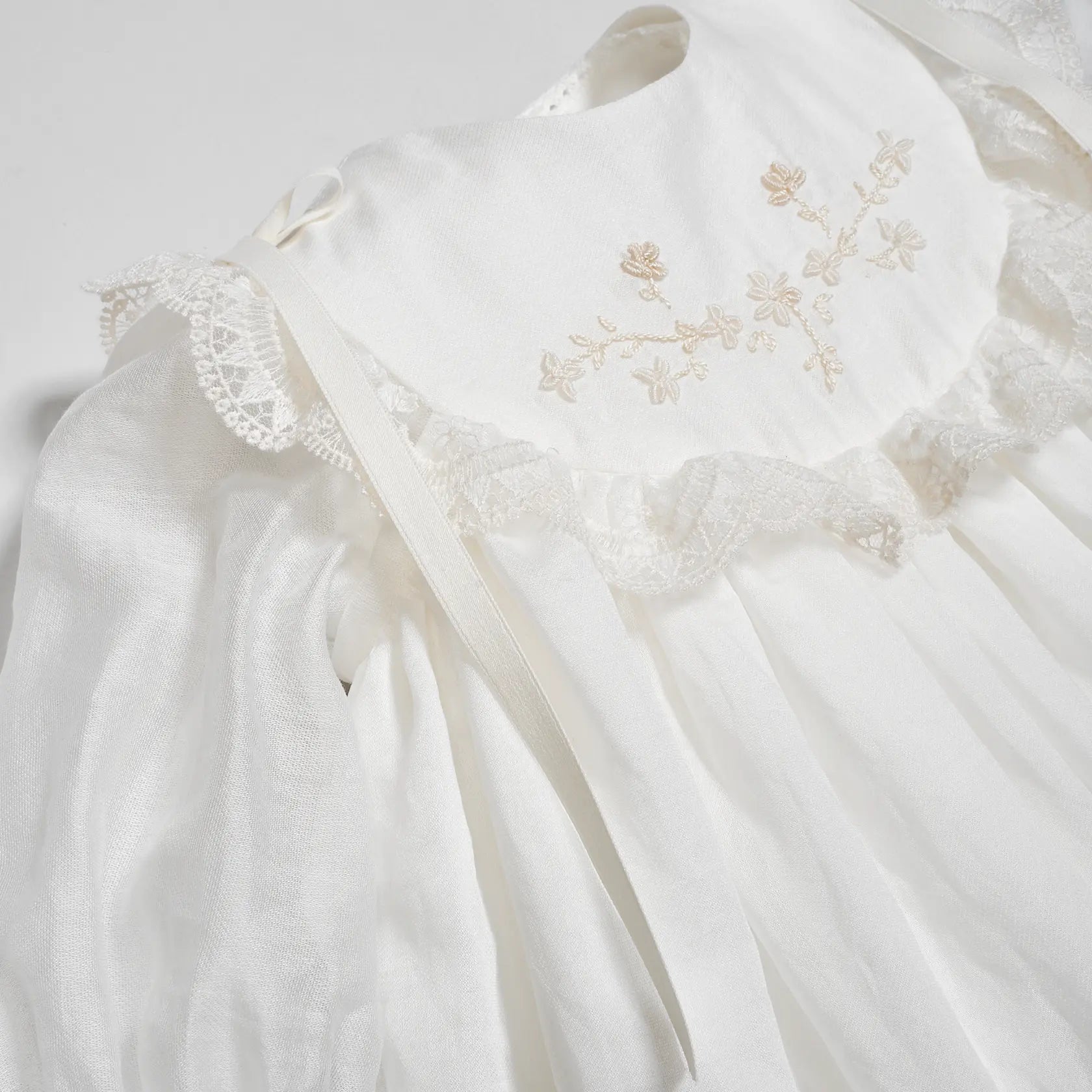 Cuenta con un pelele al que se le pone encima una especie de vestido sin mangas, que lleva un canesú mediante su puntilla fruncida y un zócalo en el bajo de puntilla fruncida y unos lacitos en los hombros; Lo más destable es su pecherita bordada a mano tan ideal. El dulce pelele de manga larga también es del mismo tejido crudo y acabado con una fina piculina, con el que nuestro bebé estará cómodo sin necesidad de cambiarlo de conjunto. Y además se puede volver a utilizar.