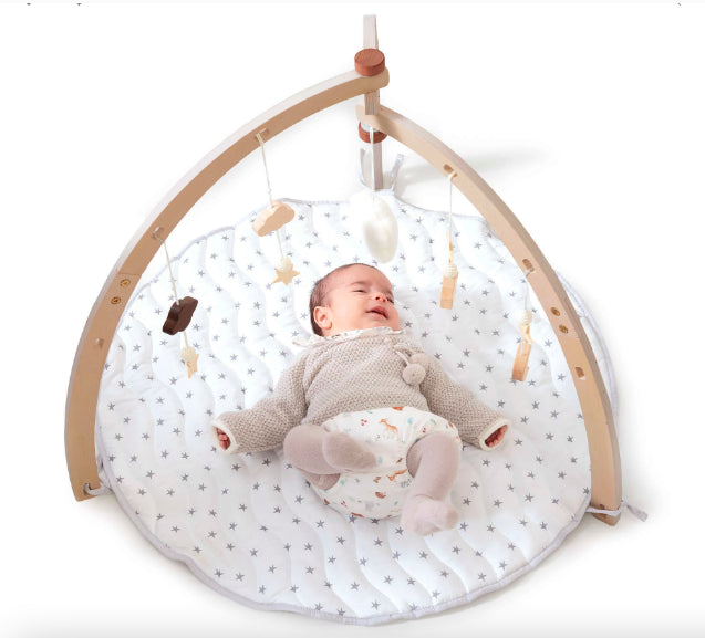 Este gimnasio Montessori para bebé Active Gym está fabricado con madera y se basa en los principios de la filosofía Montessori. Es un gimnasio para bebés de 0 a 6 meses que tiene como objetivo desarrollar las habilidades motoras y los reflejos del bebé. Incluye 3 elementos: una alfombra en la base, estructura plegable de madera y unos colgadores o juguetes que se colocan en el centro para que el bebé pueda interactuar con ellos. Gracias a su estructura plegable, podrás llevártelo a dónde quieras.
