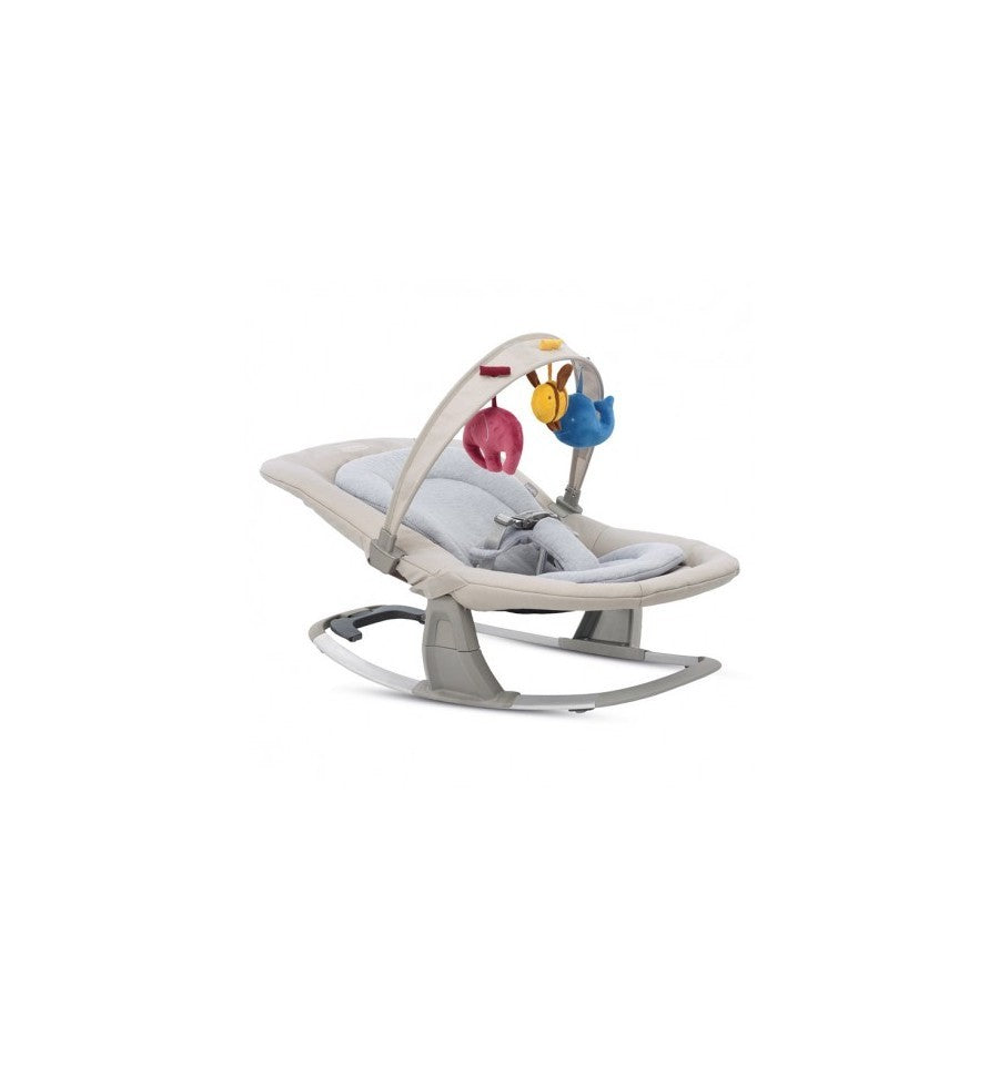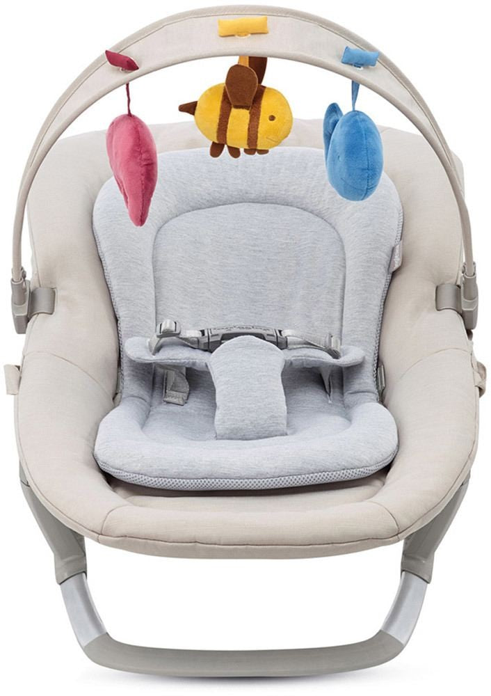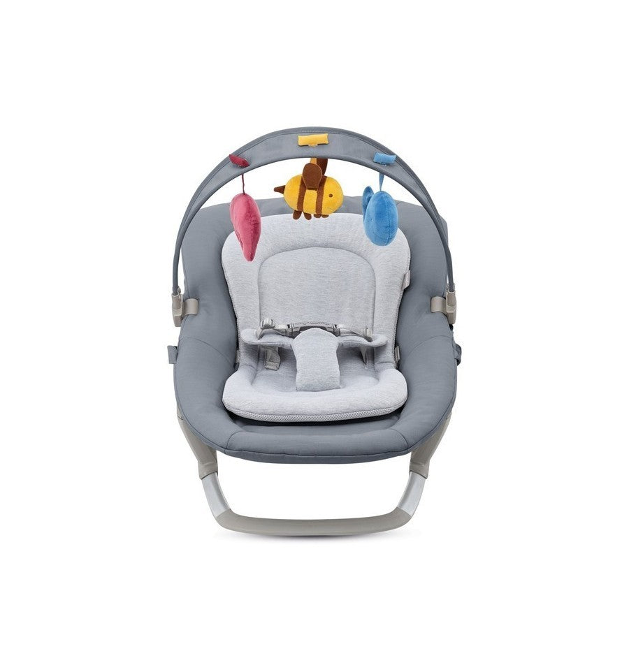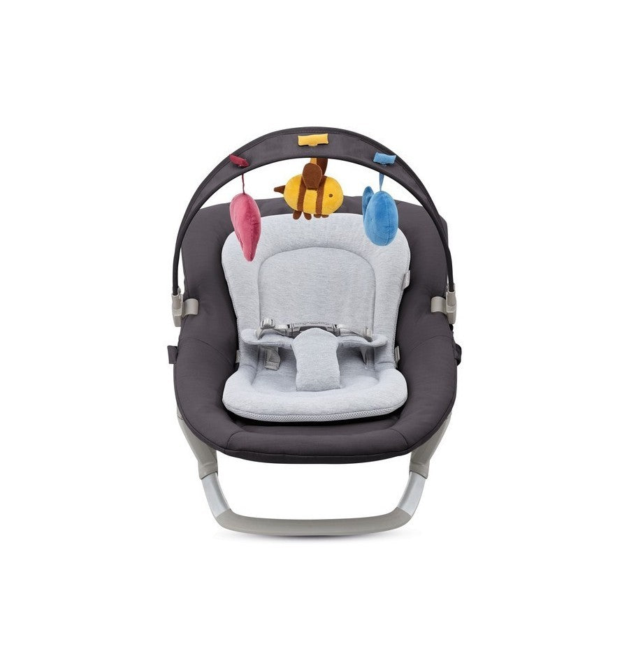 Incluye: barra de juegos con tres suaves peluches con efecto táctil y sonoro que puede engancharse en distintas posiciones, Music box con 3 melodías clásicas, suave almohadilla reductora para los primeros meses y arnés de seguridad forrado con suave tejido.
