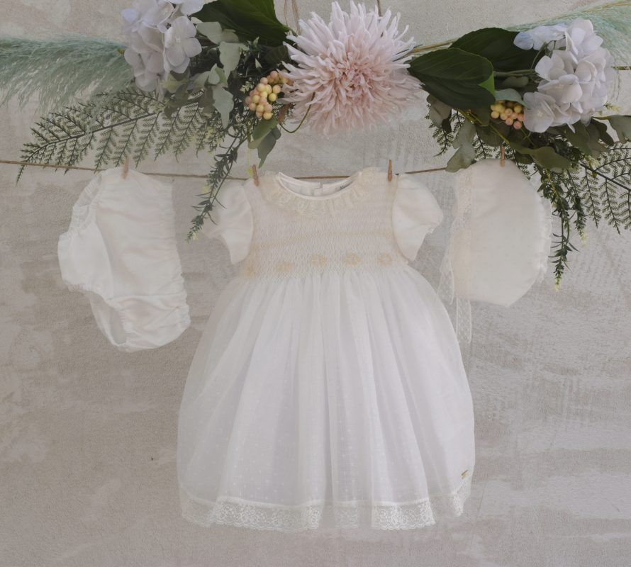 Este jesusito de ceremonia forma parte de la exclusiva colección Bebé de Niseret, diseñado para momentos únicos. Confeccionado en muselina inglesa topo, destaca por su cuerpo delicadamente decorado con un bordado artesanal en nido de abeja que aporta textura y elegancia. Su cierre trasero mediante botones facilita el vestido y garantiza un ajuste perfecto. Incluye capota y braguita a juego, completando un conjunto armonioso y práctico. Este diseño, fabricado cuidadosamente en España, refleja la calidad y el detalle que buscan los padres para vestir a sus pequeños en ocasiones especiales.