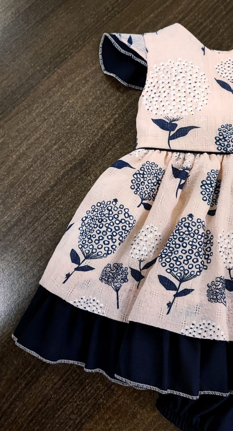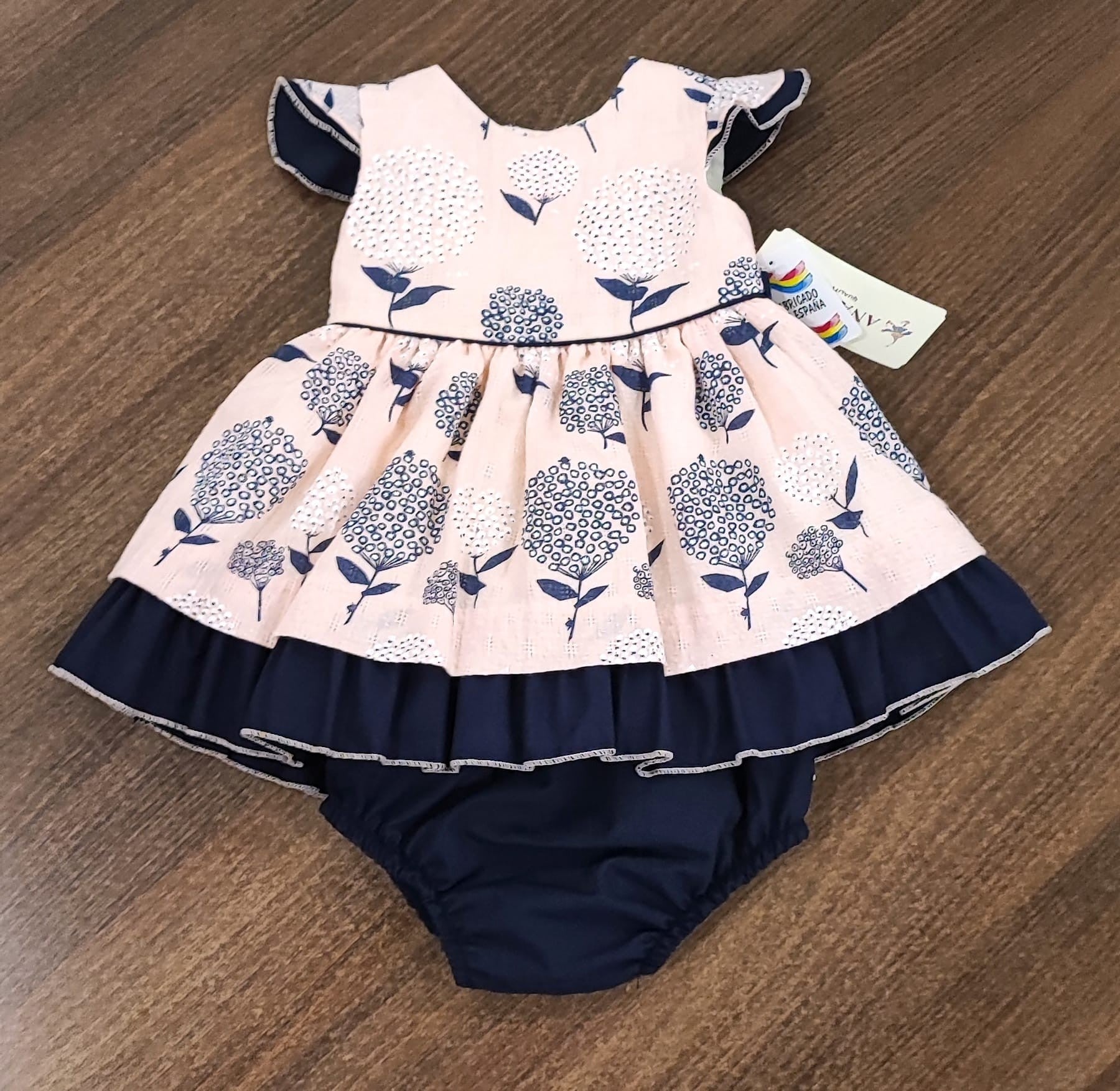 Vestido de manga corta en color salmón y azul marino con bonito estampado de mimosas.