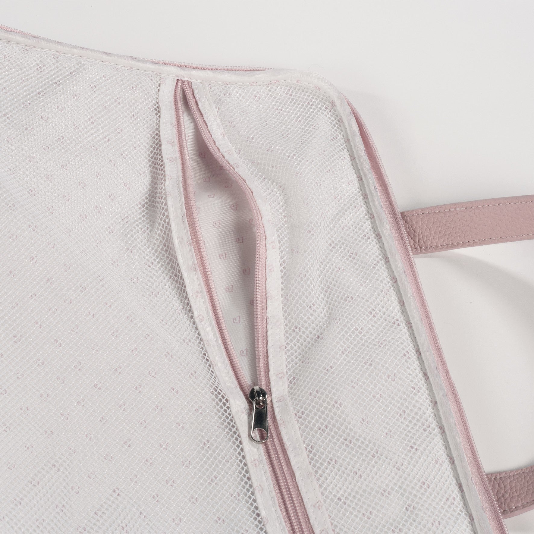 La maleta de hospital cuenta con un forro interior con gomas para sujetar la ropita y se cierra de forma segura con cremallera de dos lados que permiten abrir la tapa completamente.