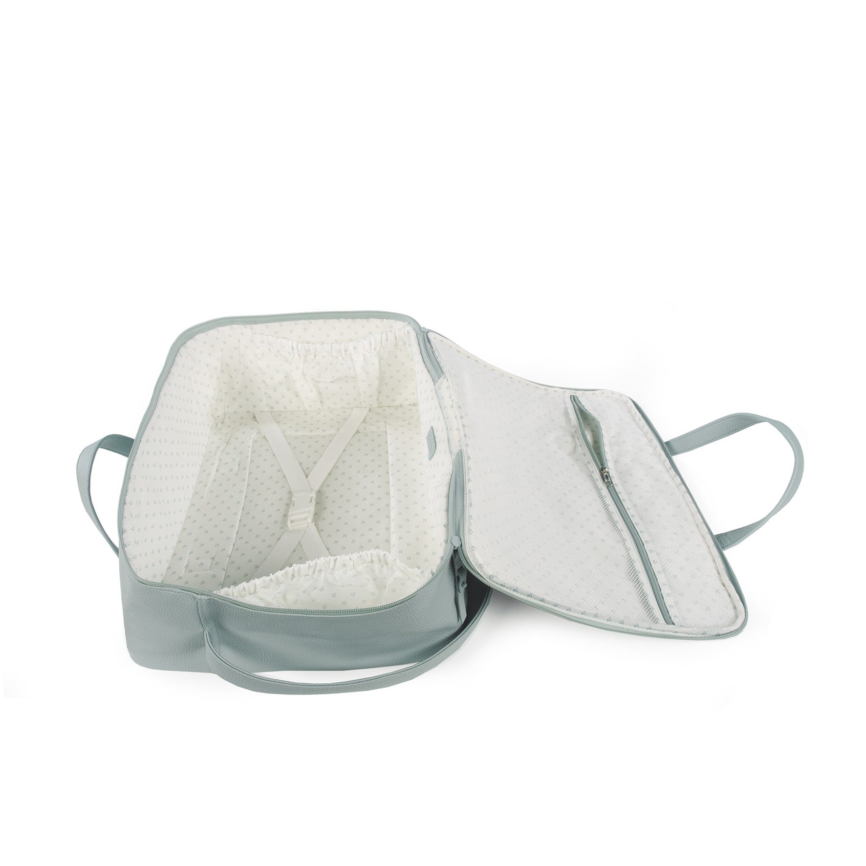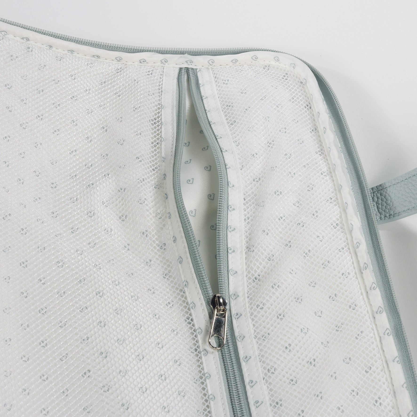 Está elaborada en resistente y suave polipiel con tonalidad clara y forma rectangular que brinda comodidad para tener cubiertas todas tus necesidades (mudas o accesorios) durante el día del nacimiento del bebé.